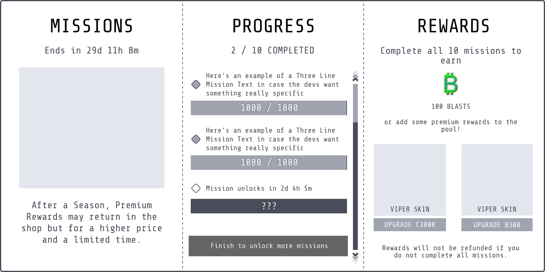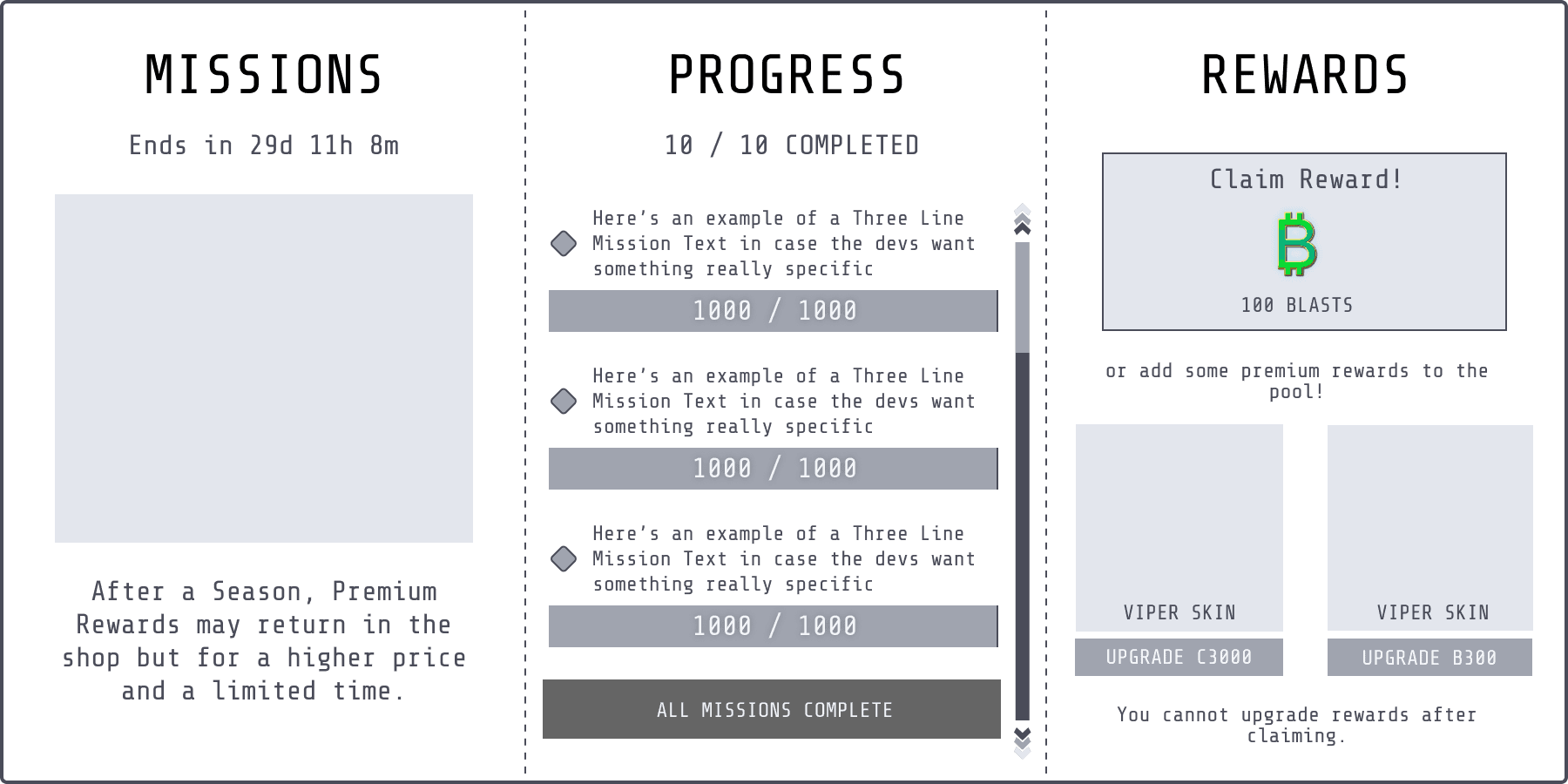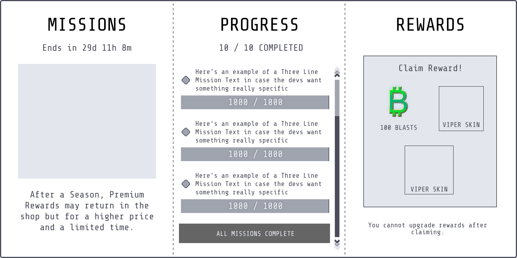 This pane now explains the default reward for all, which is a certain amount of premium currency (Blasts). The amount is now clarified, and the instruction to add rewards now tells that these rewards underneath are premium and are added to the pool to claim after completion of the 10 missions if the player upgrades the reward pool. The claiming state is simplified also, allowing the player to claim all rewards available should they meet the requirements. There is also text added to tell the player that the after claiming rewards they cannot upgrade their reward pool further.