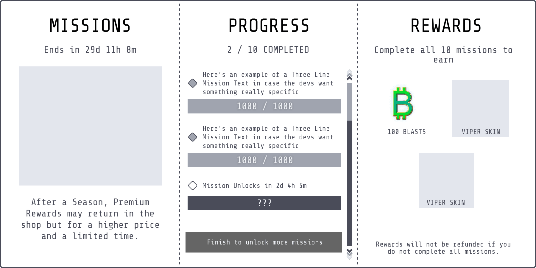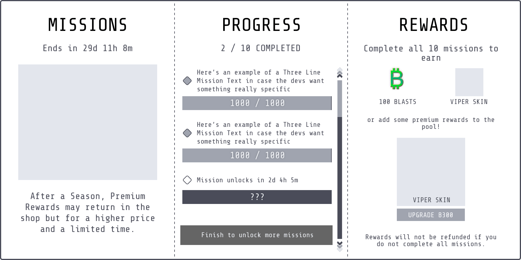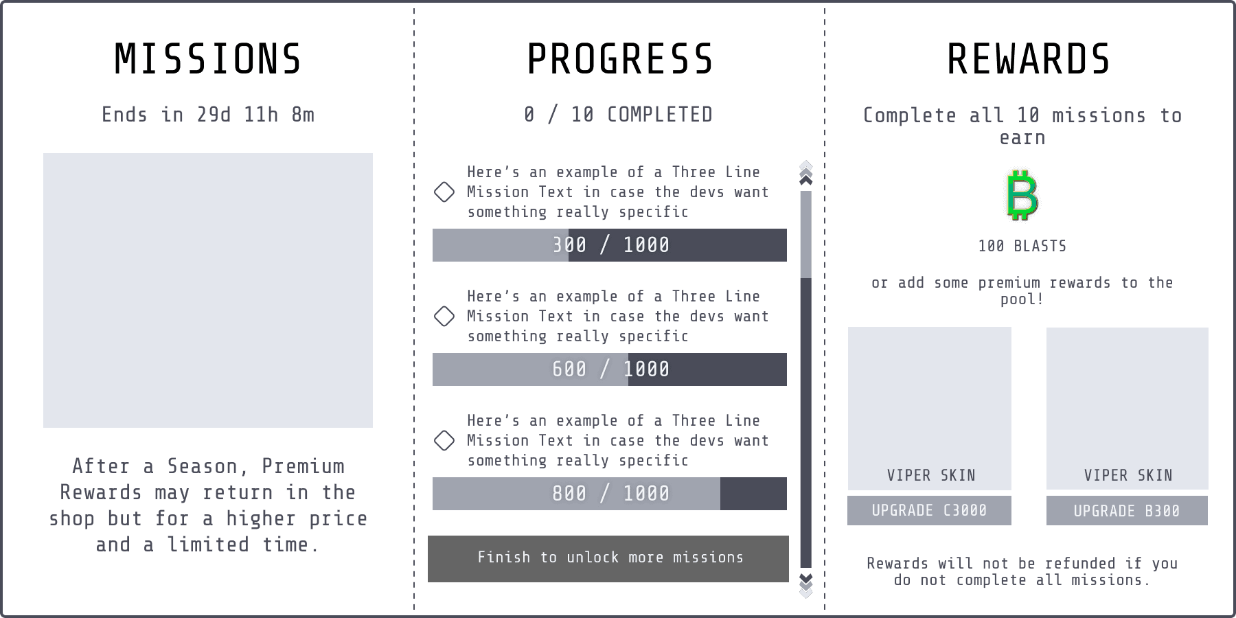 This pane now explains the default reward for all, which is a certain amount of premium currency (Blasts). The amount is now clarified, and the instruction to add rewards now tells that these rewards underneath are premium and are added to the pool to claim after completion of the 10 missions if the player upgrades the reward pool. The claiming state is simplified also, allowing the player to claim all rewards available should they meet the requirements. There is also text added to tell the player that the after claiming rewards they cannot upgrade their reward pool further.