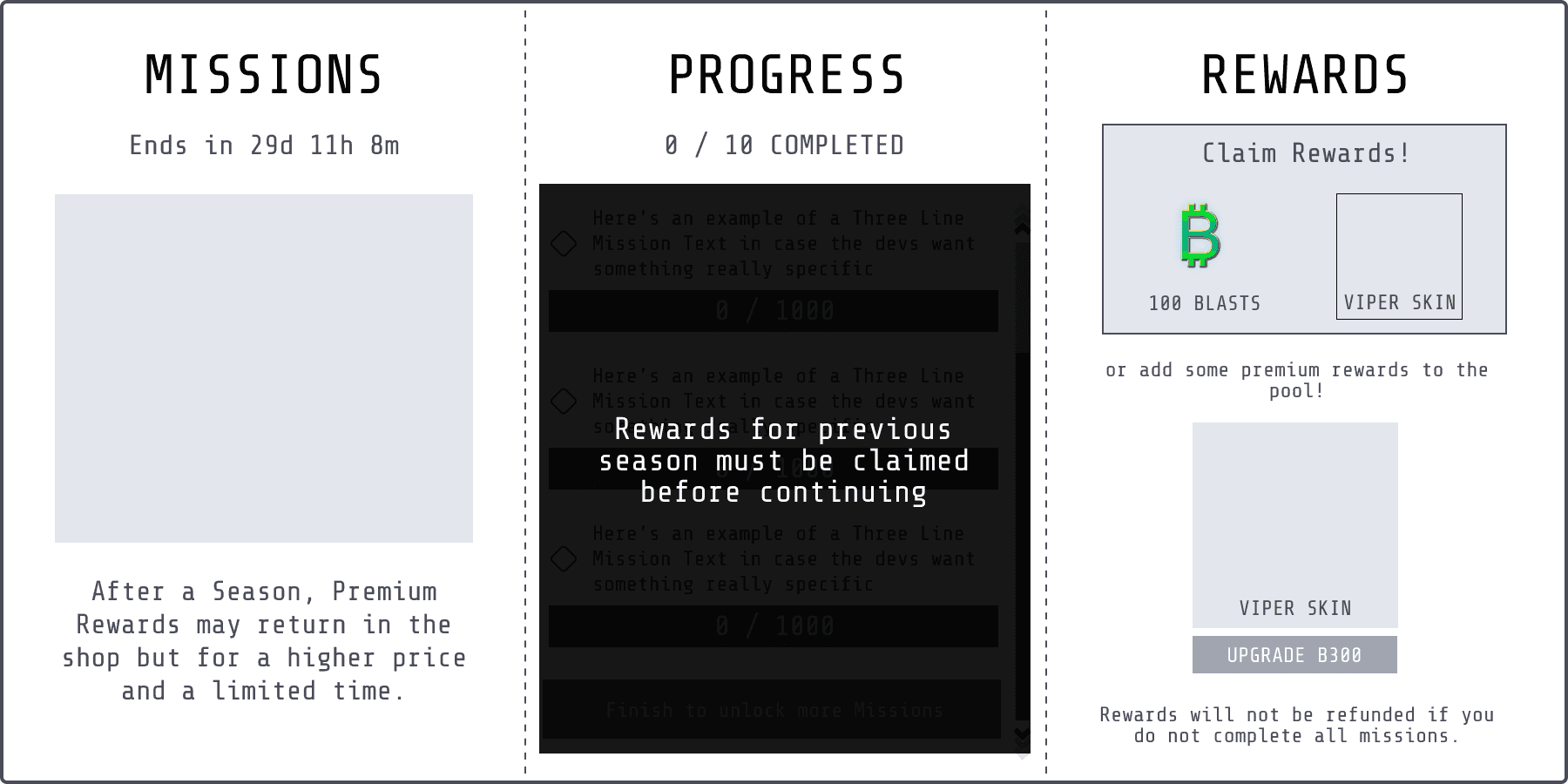 Next was to inform the player about once they claimed and how they would have to claim the previous seasons rewards in order to continue the next season’s missions.
