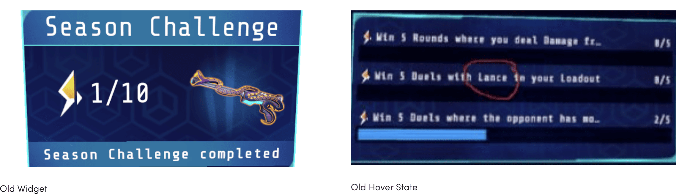 After dealing with the main UI, the last thing to do a pass on was the widget itself on the homepage that opens the UI. This had some similar issues with text size and localization issues. The main widget state had the progress and the reward that the player didn’t have. The hover state showed in progress missions but he widget could only track 3 of the missions that were present so I did a pass over it to track the missions like the main interface.