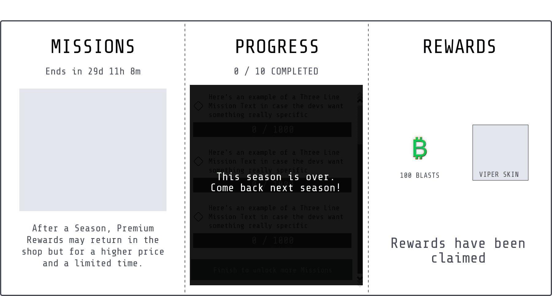 Here the missions UI is locked with an instruction to come back and check next season for more. The text on the rewards pane lets the player know their rewards have been claimed.