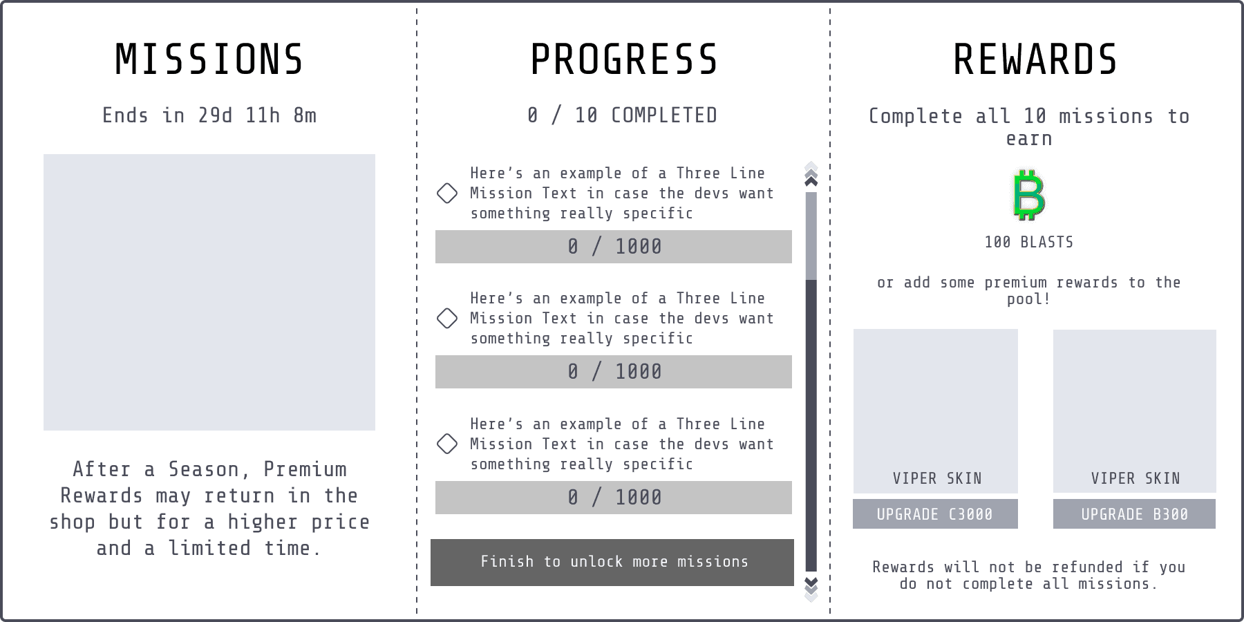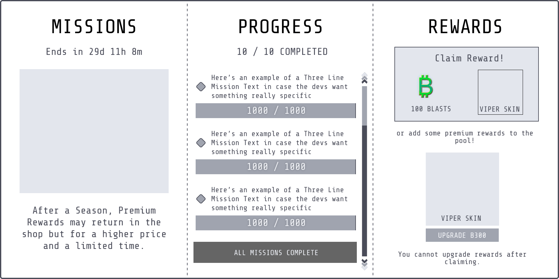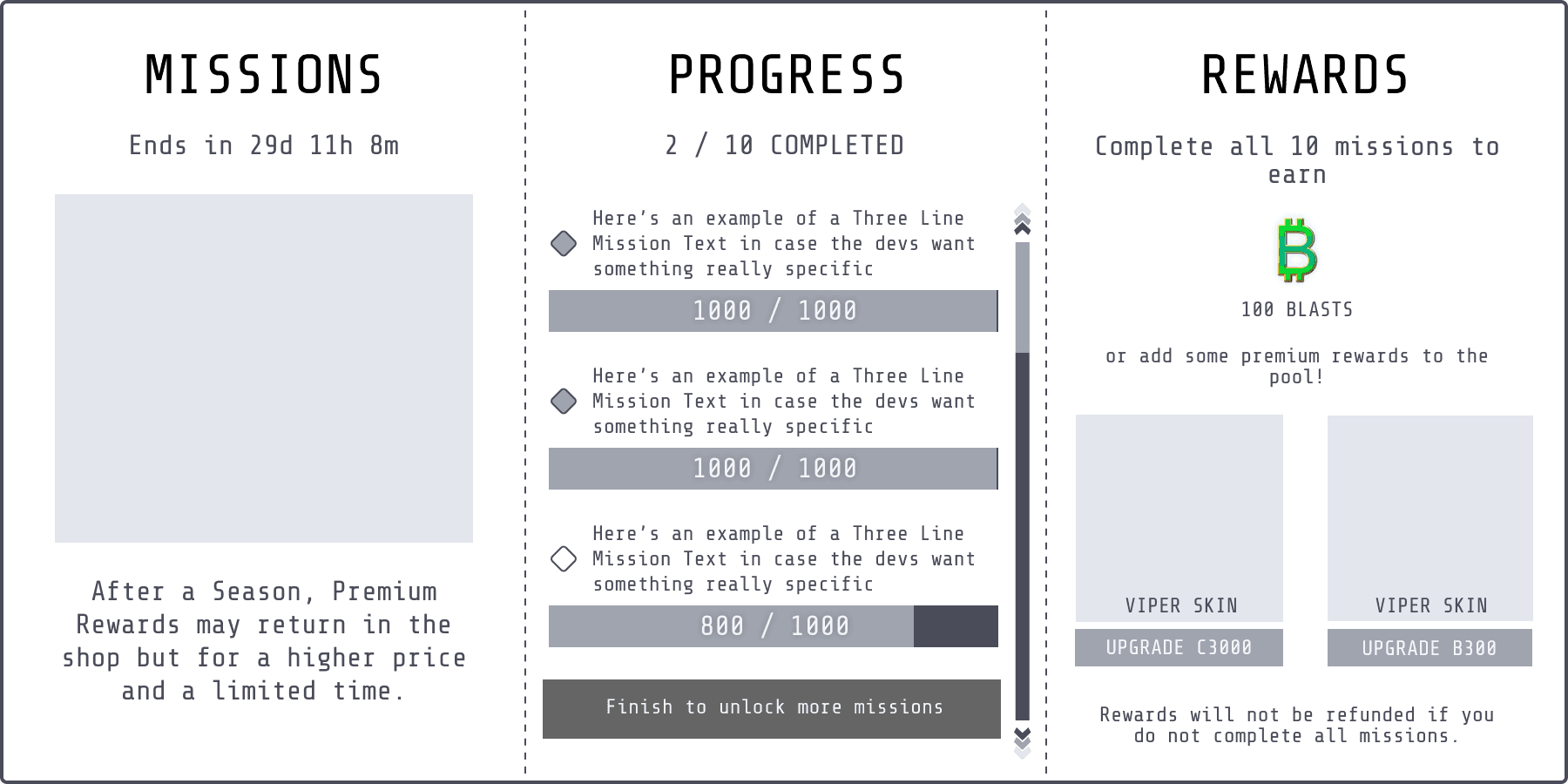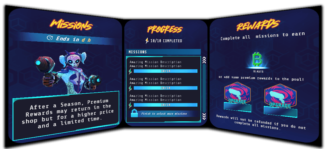 I was asked to take a look at the Missions UI to redesign it as it had some usability and technical issues. I hadn’t work on any of the main interfaces in Blaston previously so it was a welcome task to get familiar with how the main UI worked and what we could start to lay the groundwork for upcoming redesigns and features. The Missions UI was a great feature as it was designed to give players tasks to work towards and get great rewards in the process with the ability to upgrade their rewards to include exclusive skins should they finish at least 10 missions in the month.