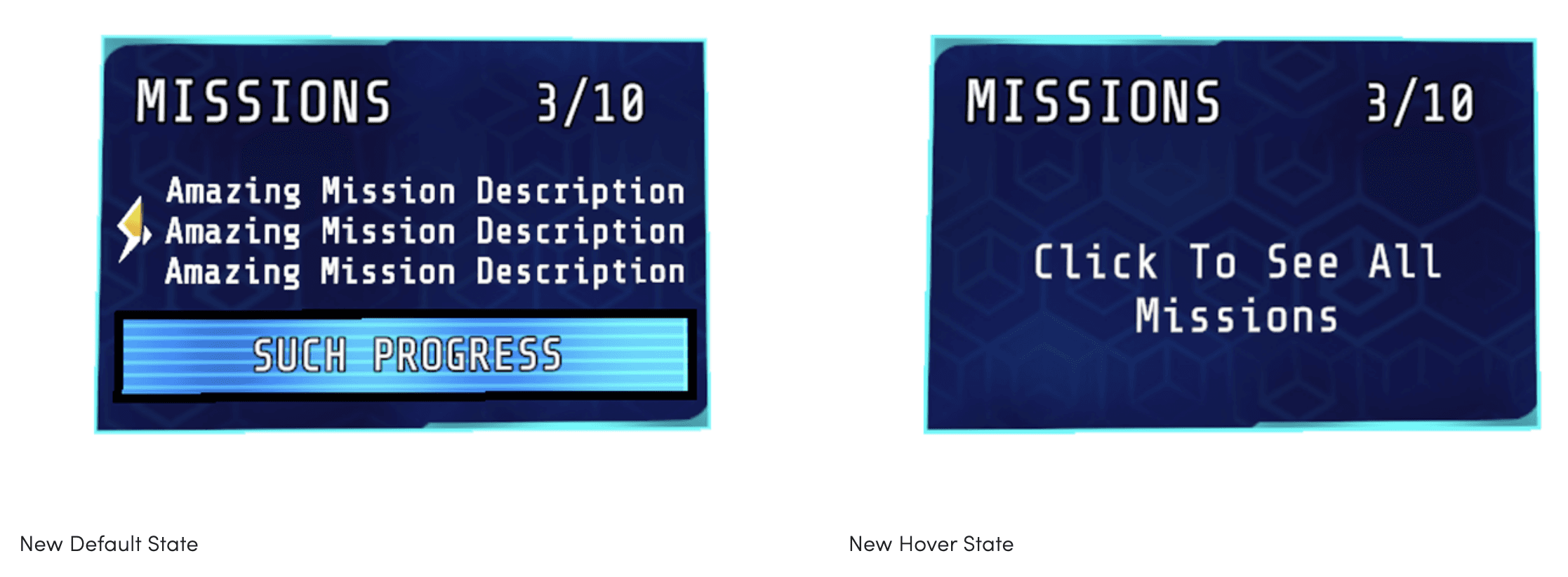 The main thing I wanted to accomplish here was to make the widget fulfill it’s purpose - to track the progress of the player in their mission. Clarifying the widget to also allow the player to know that clicking this widget would open up the interface which wasn’t exactly clear in the previous hover state.