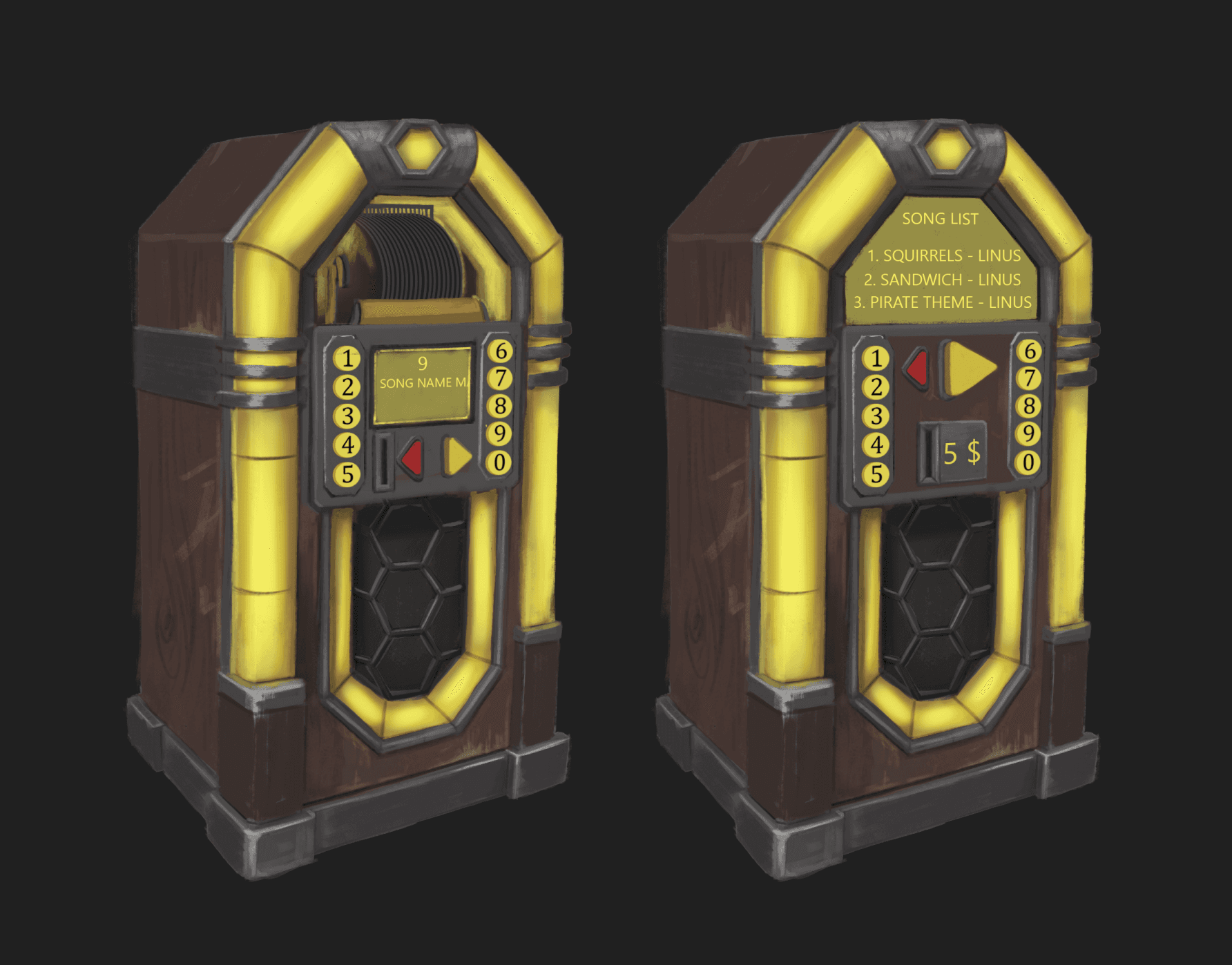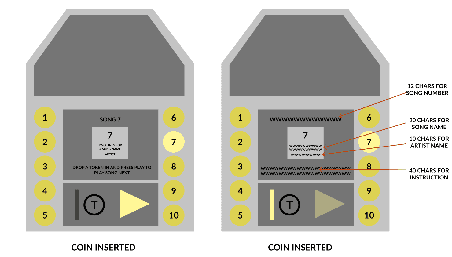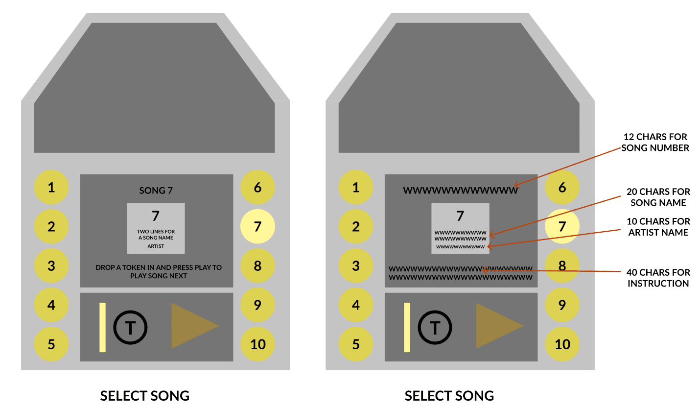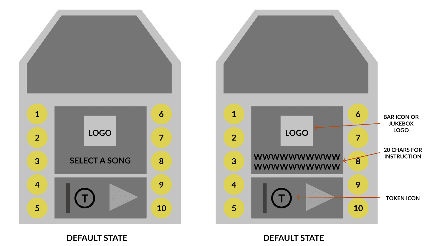 The default state is when things are active to use. A song is not playing so the jukebox can be interacted with. The buttons on the side with the song numbers are lit up to show the player they can push them. Pushing a button shows the info of song which is the next state.