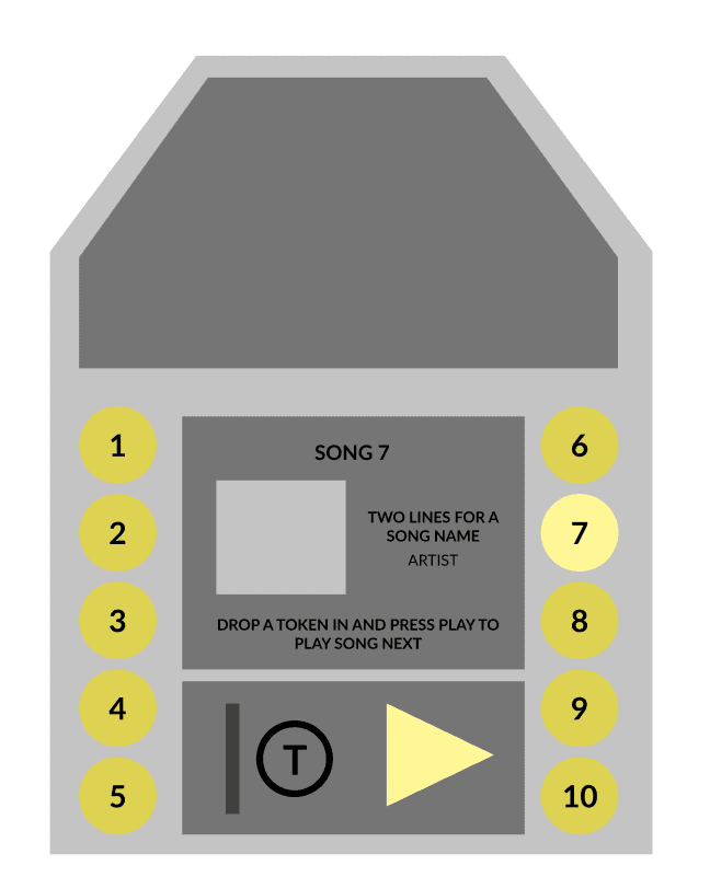 Once the coin has been inserted, the play button lights up when a song has been selected. Pressing the play button will start the song playing and go to the playing screen.