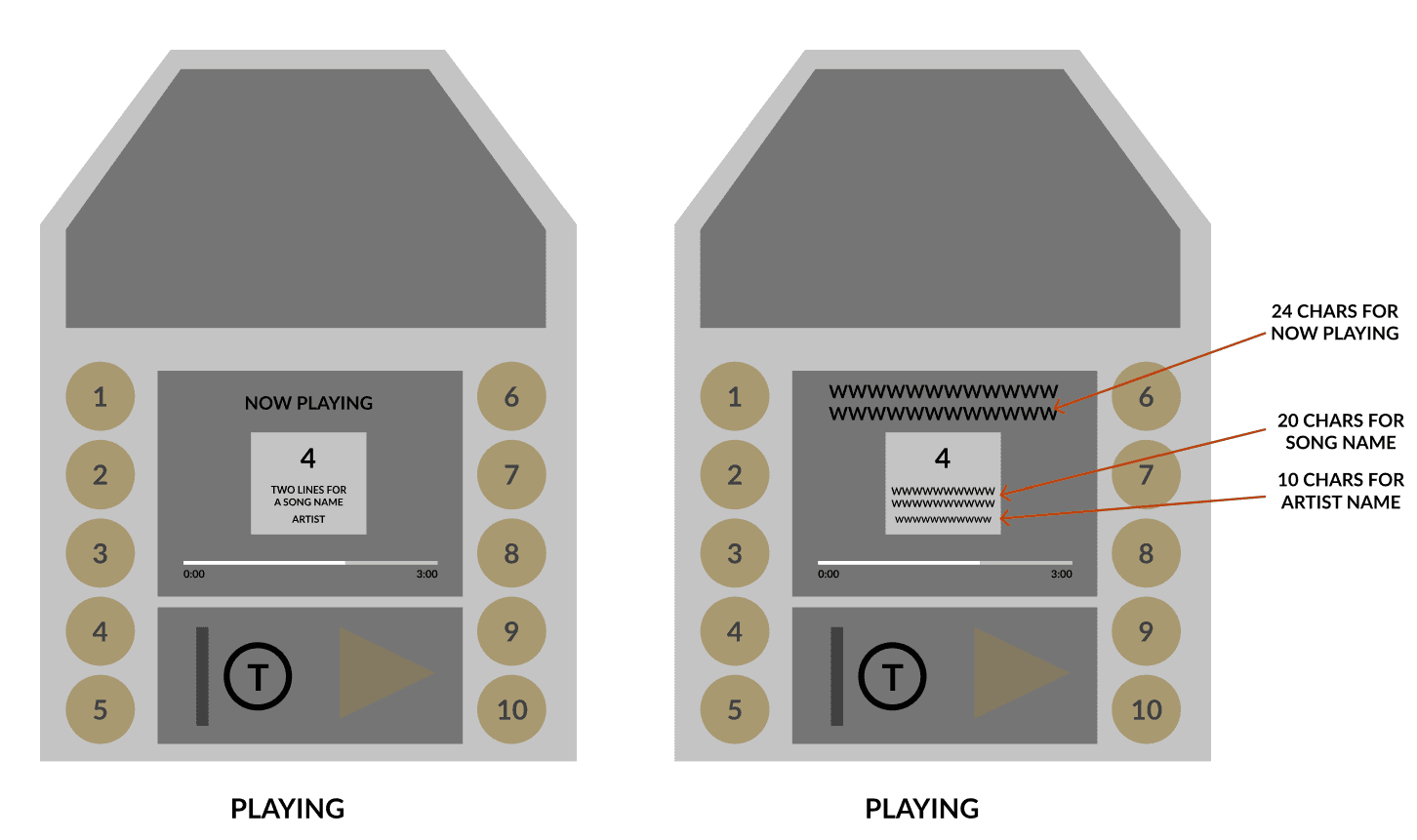 This is when a button is pressed. We should have a way to light up the button just pressed to show feedback. On-screen we see information for the song.