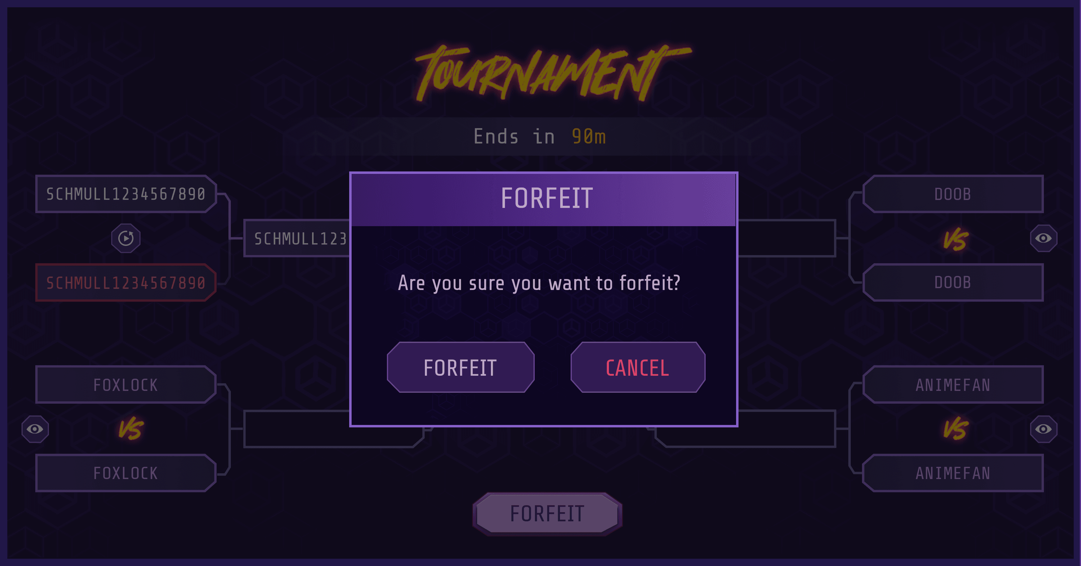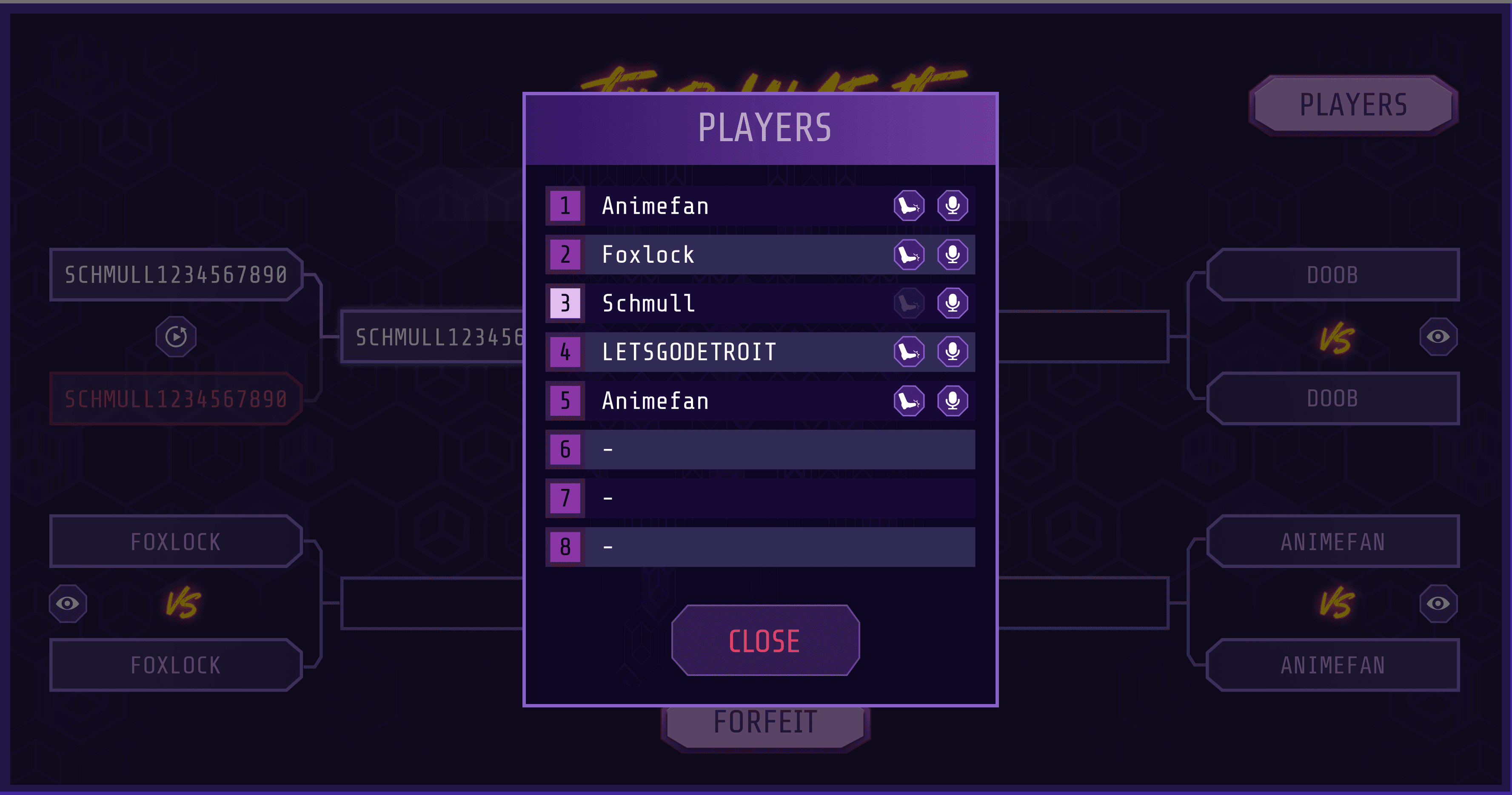 Knockout!: A screen where you can organize & play a single-elimination tournament with 2-8 players. Matches can either be spectated in real-time or watched from the replay created.