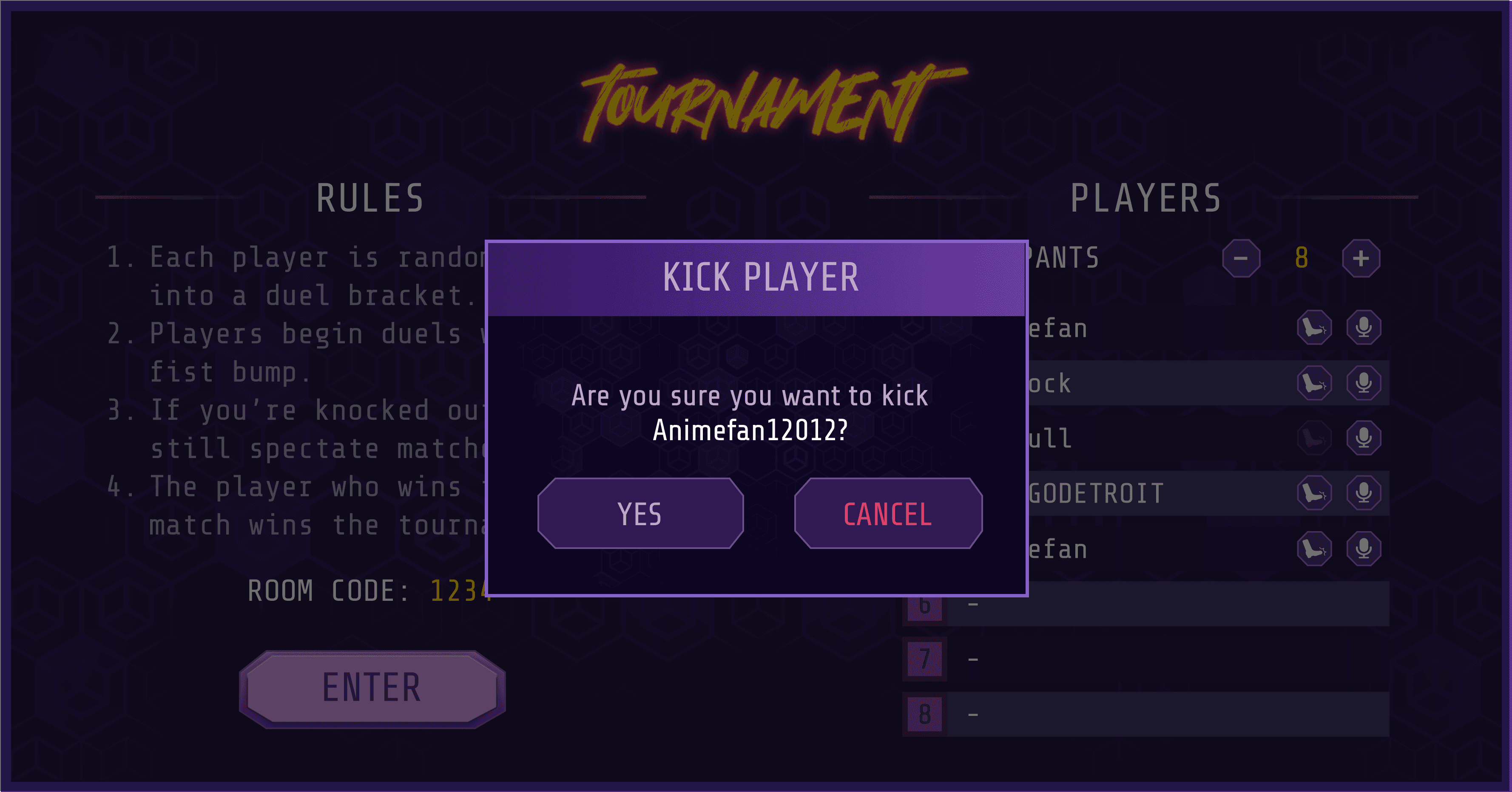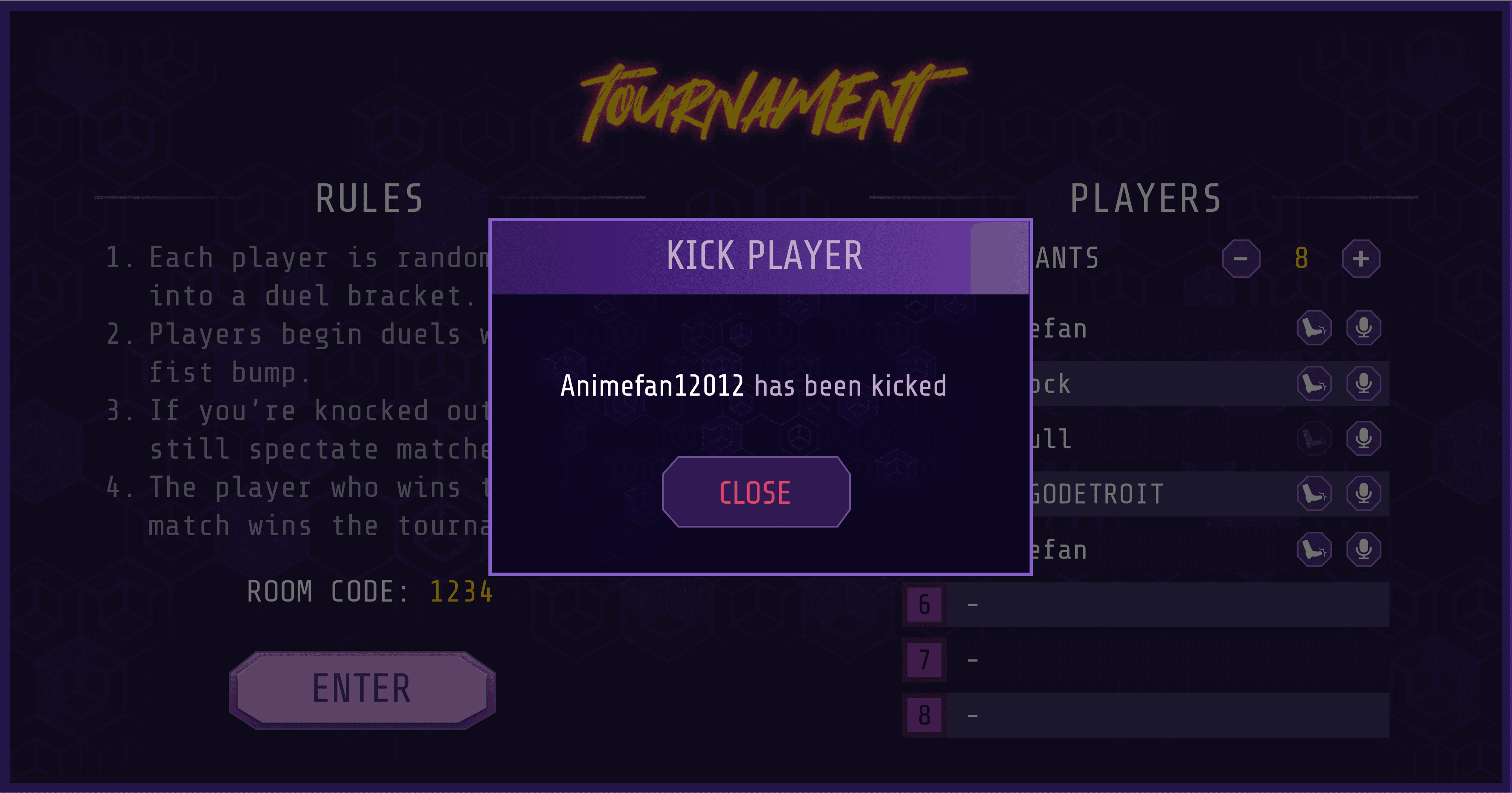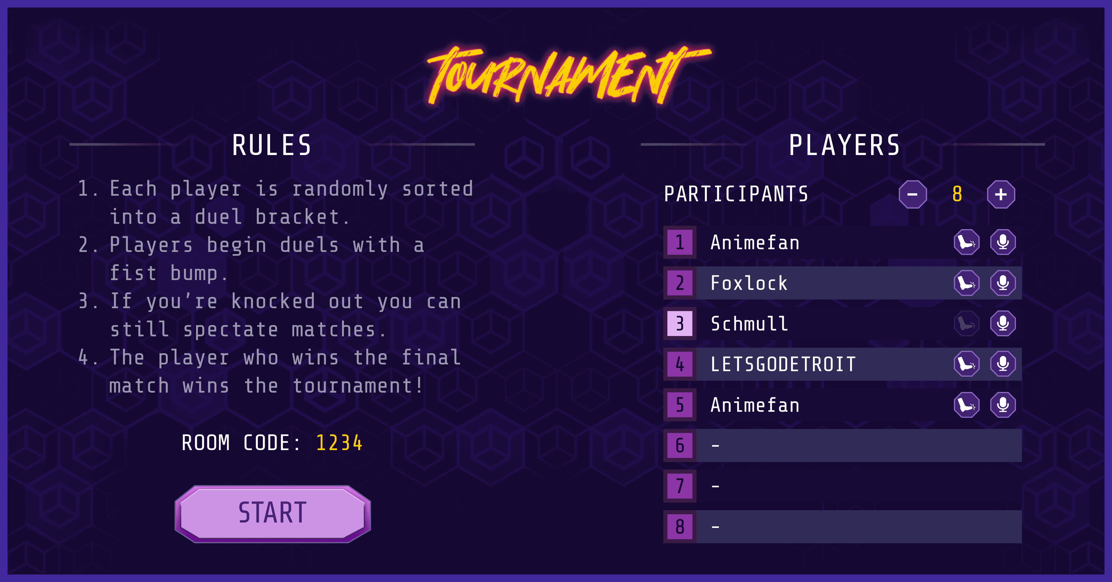 In Knockout! you can organize, host and spectate tournaments with 2-8 people. This also has room for 9 players unlike the other rooms.