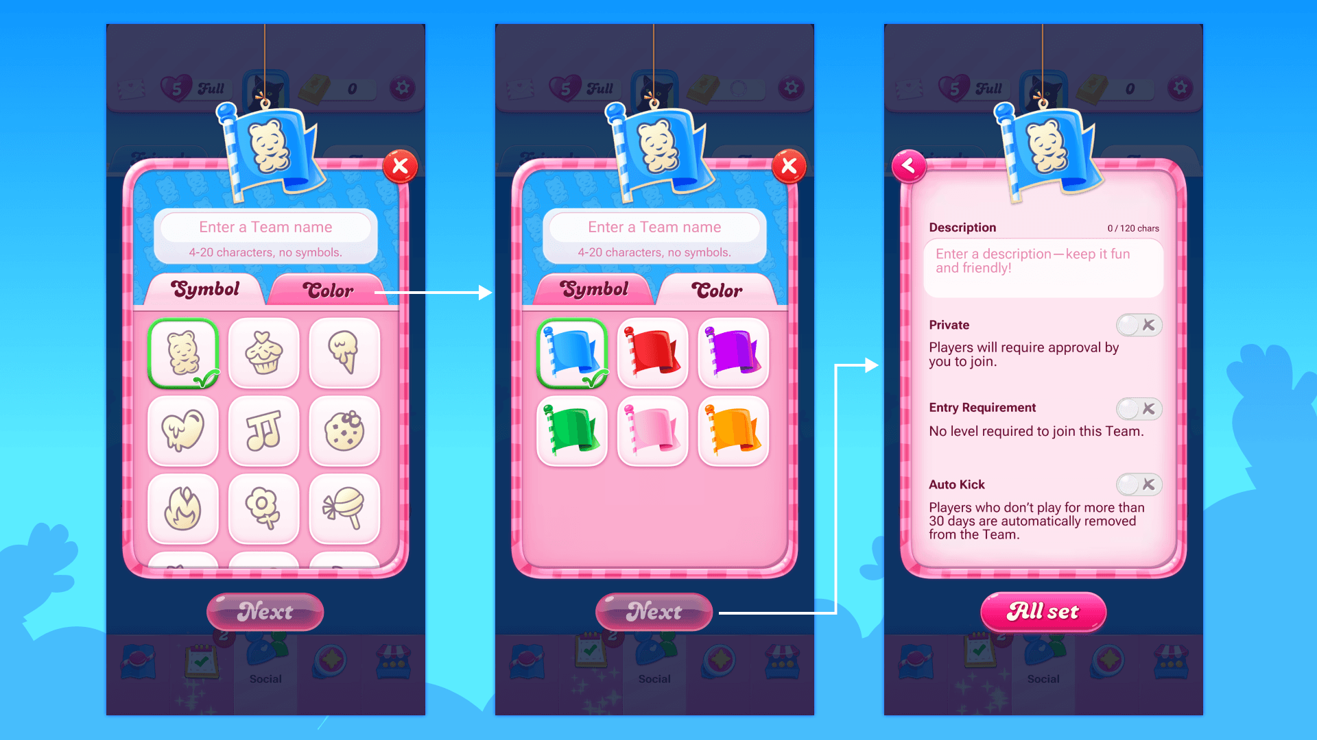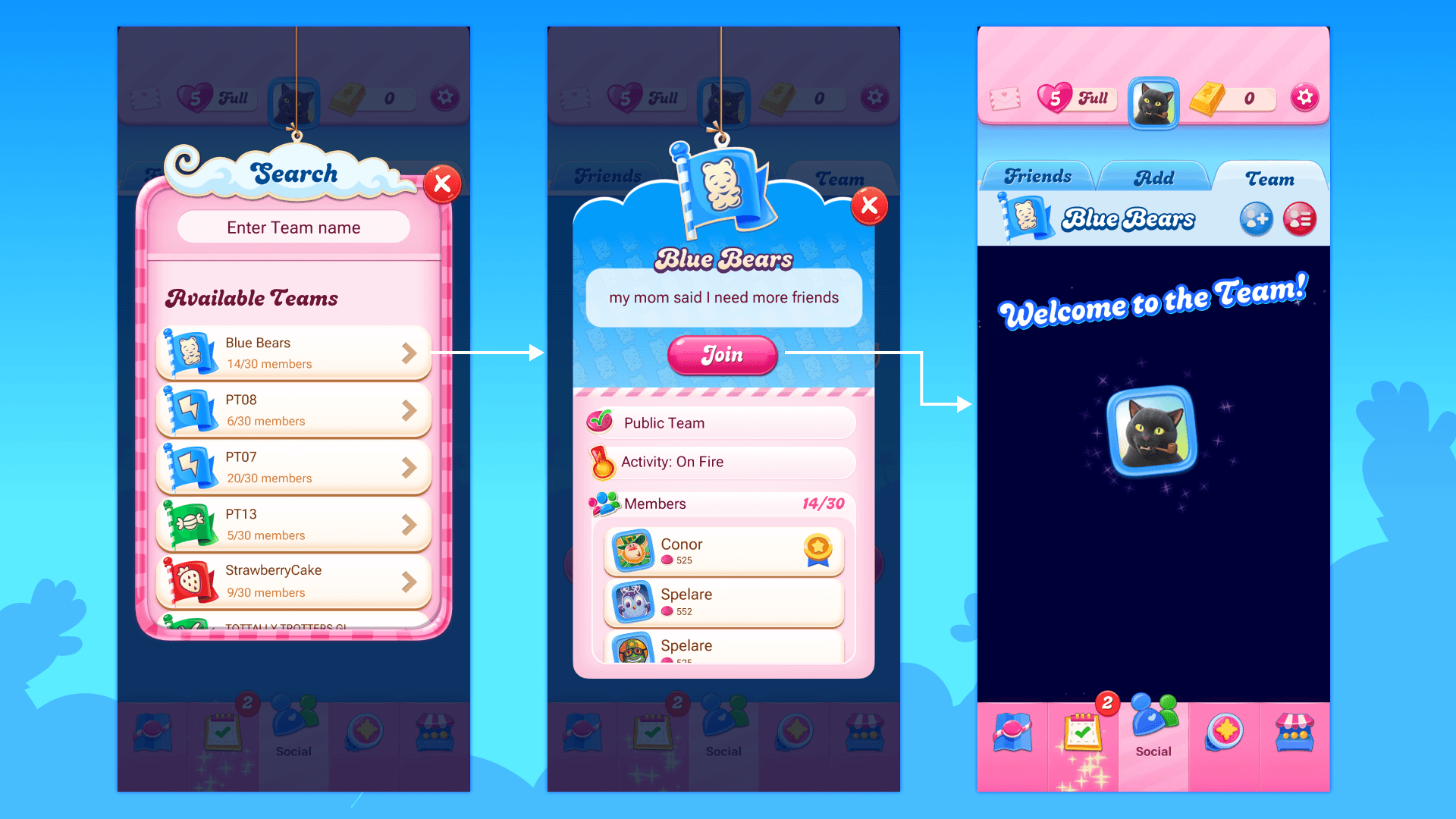 Candy Crush Teams is a new social system existing in the Social tab allowing players to join up with up to 29 others in order to do exclusive larger events for better rewards and to gain a community feeling inside the game itself.