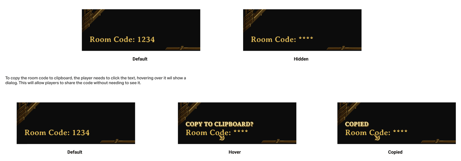 Room codes are how players join multiplayer games in Demeo VR and the same is in the PC client as you can play with VR players seamlessly. We knew the most common time players ask for the room code was while they were inside a game so it had to be accessible. We also knew that players tended to complain about people streamsniping and joining private games to clearly visible room codes.