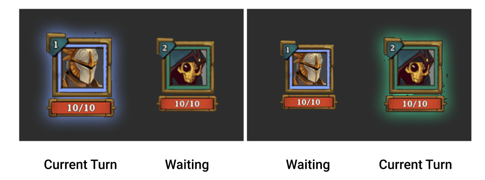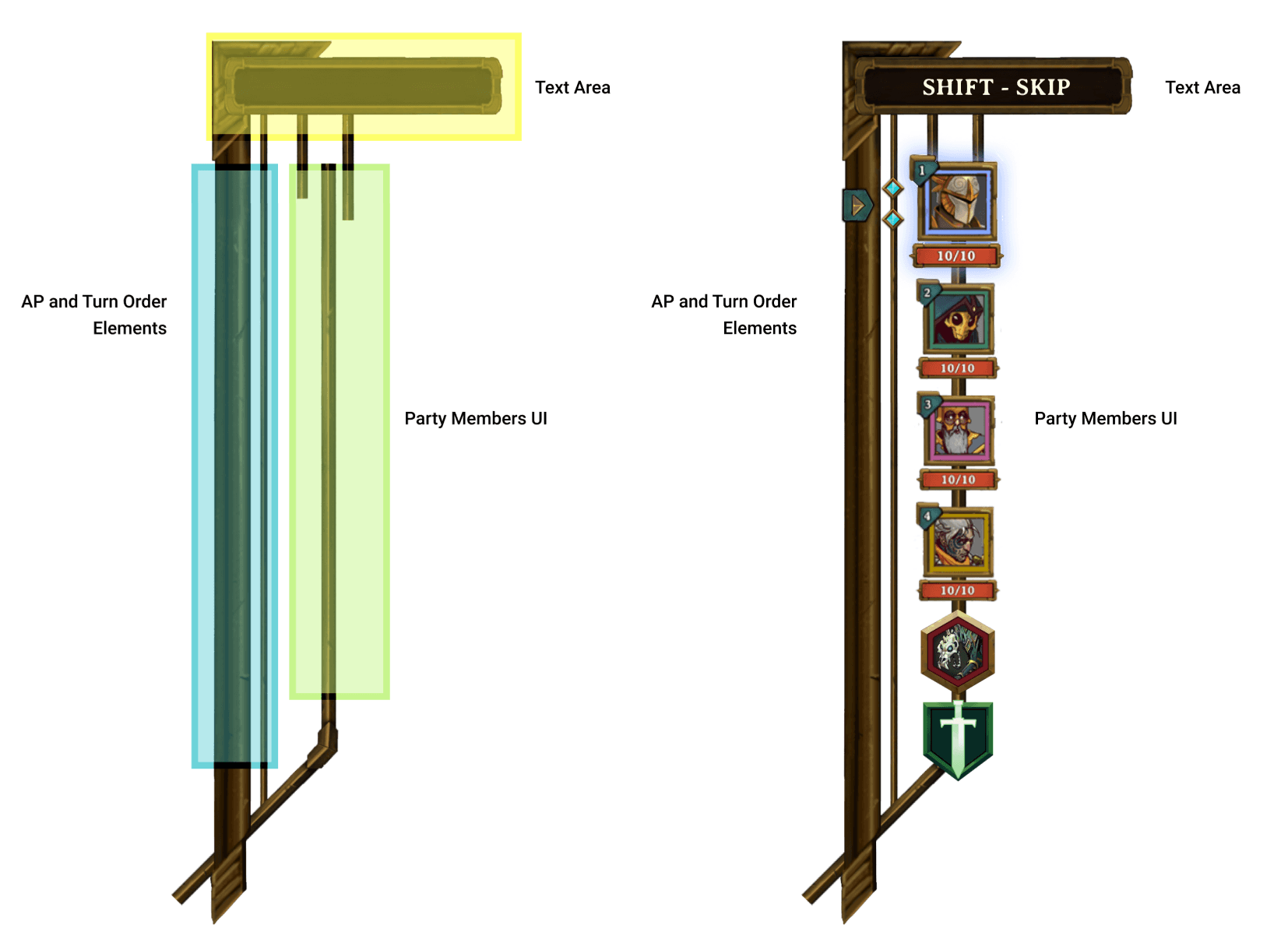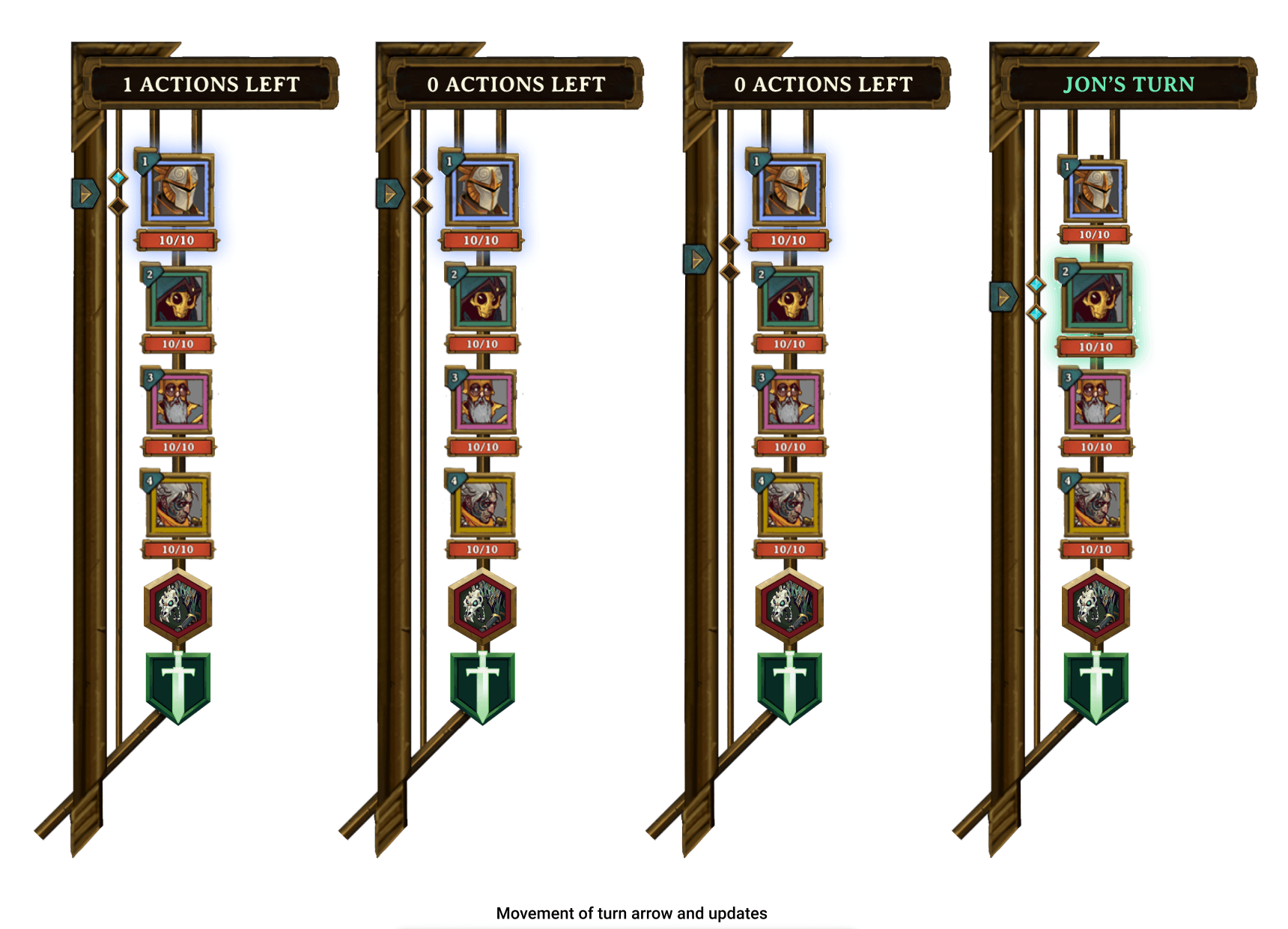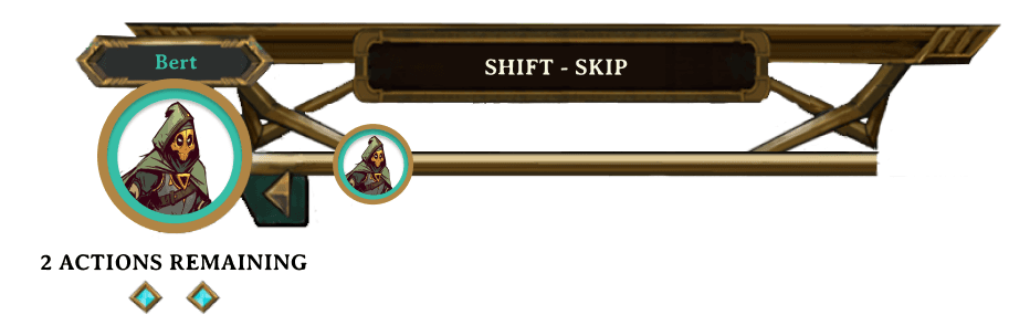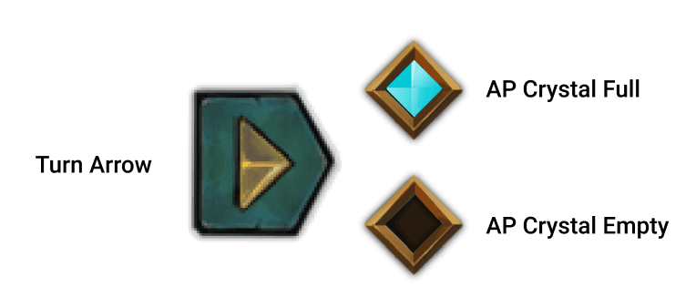 AP Crystals between the arrow and the profile icon are linked to the Player’s Actions. These are centered and can scale for the many AP that a player may have. These AP crystals hide on the enemies and allies turns.