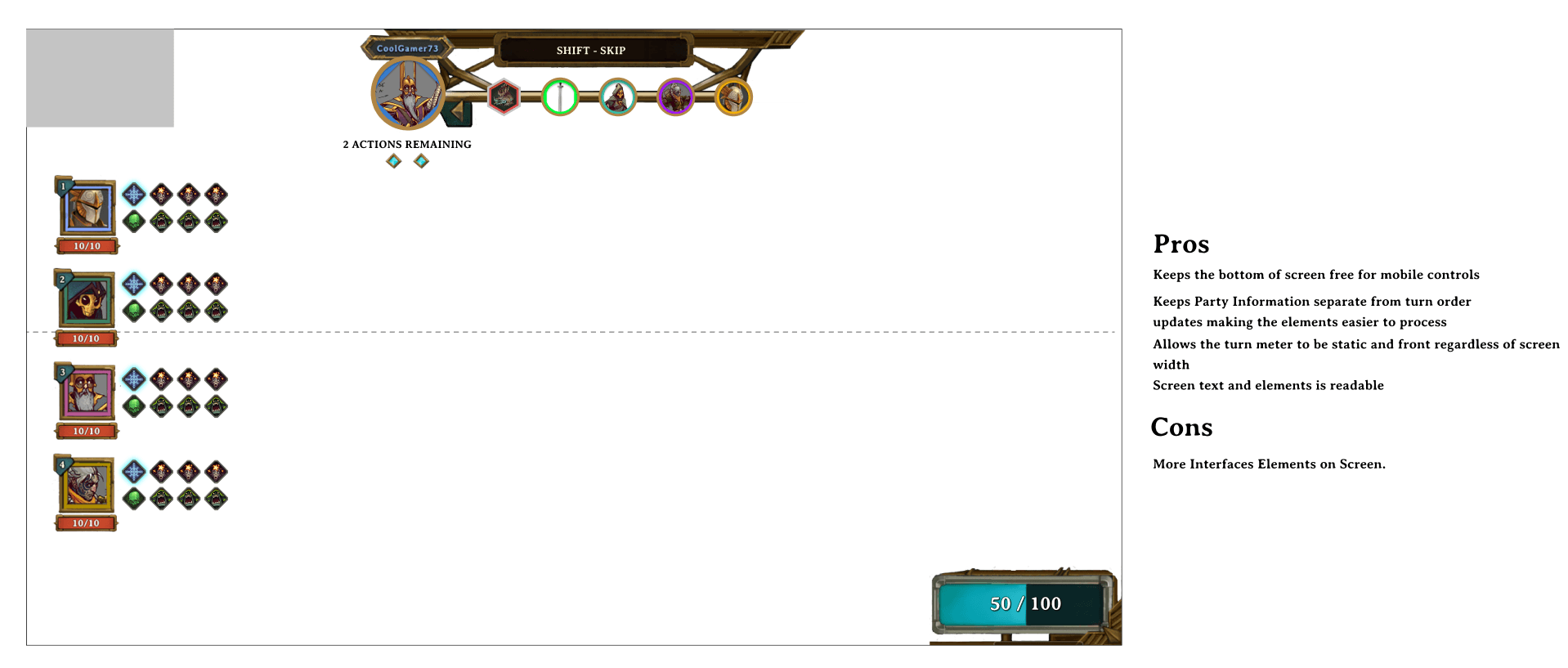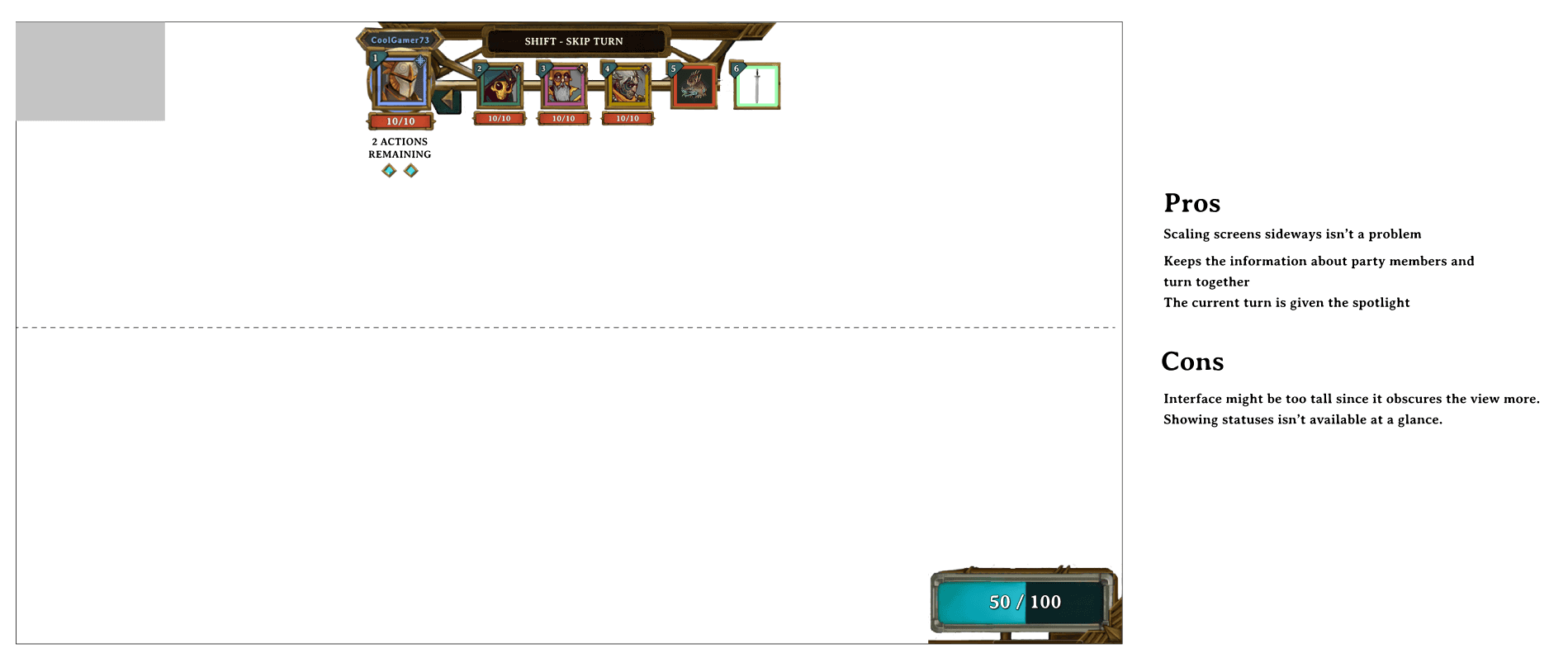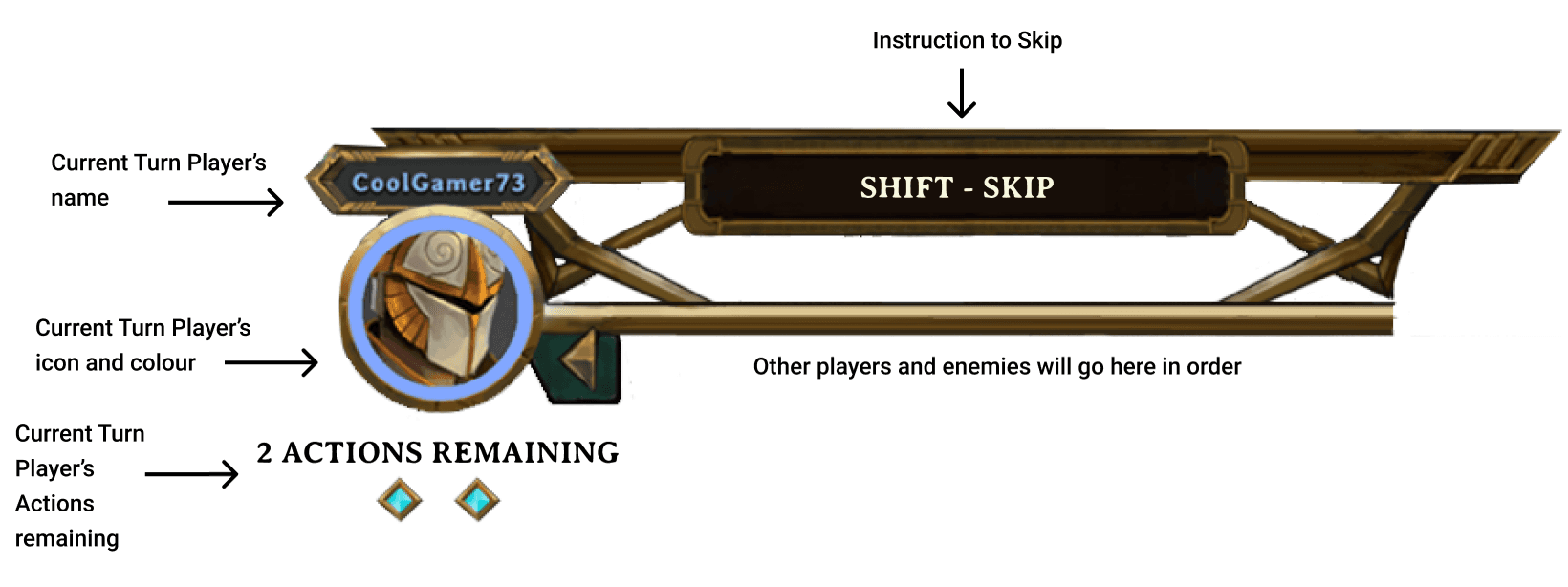 The turn meter is anchored to the top of the screen and centered horizontally. It lets the player know who’s turn it is, who is coming up next, how many actions they have remaining and then how they can skip their turn.
