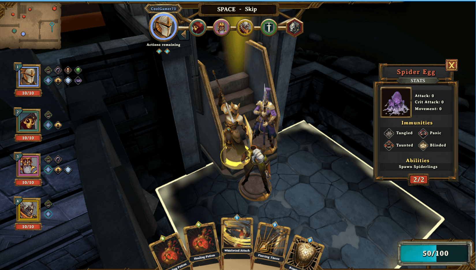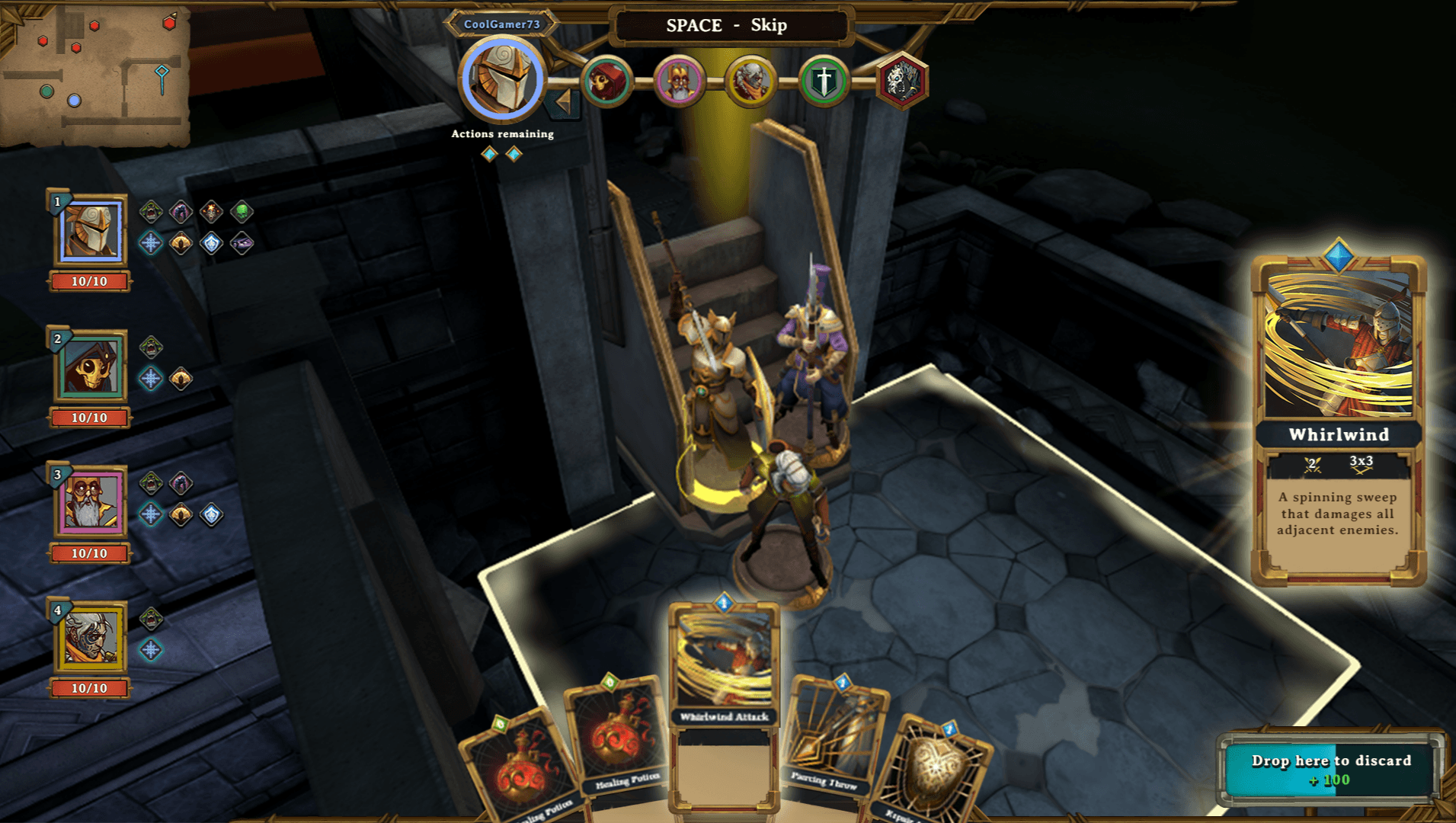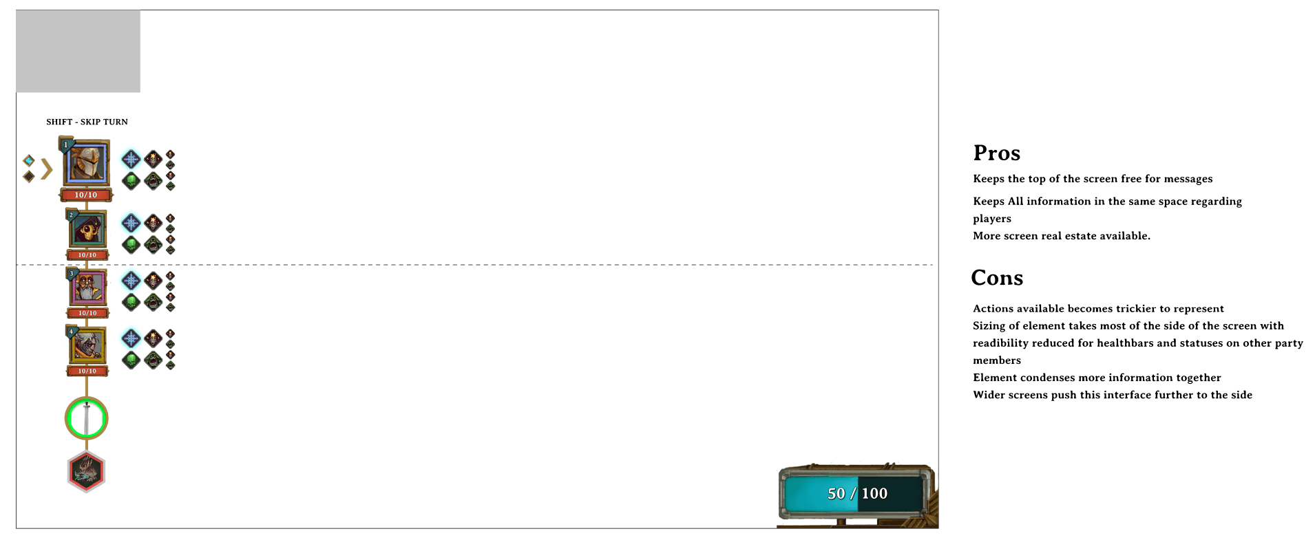 The turn meter is anchored to the top of the screen and centered horizontally. It lets the player know who’s turn it is, who is coming up next, how many actions they have remaining and then how they can skip their turn.