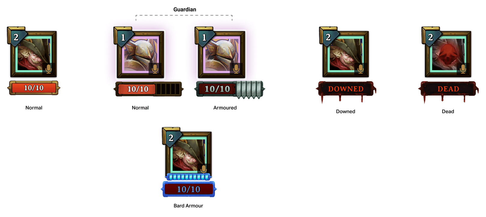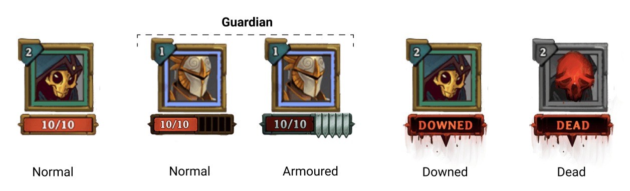 The healthbar has 5 variants, normal, guardian normal, guardian armour, dead, and downed.