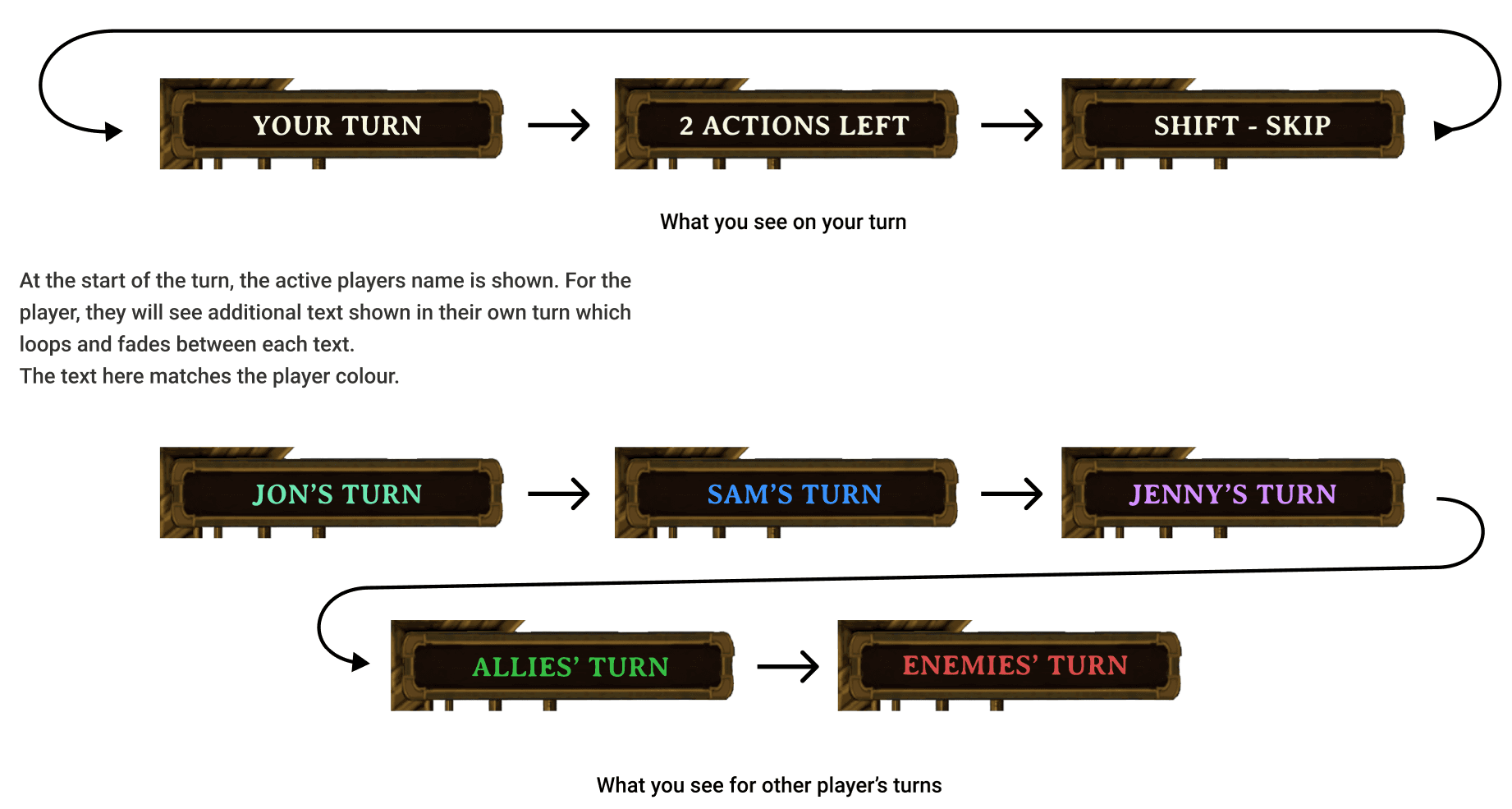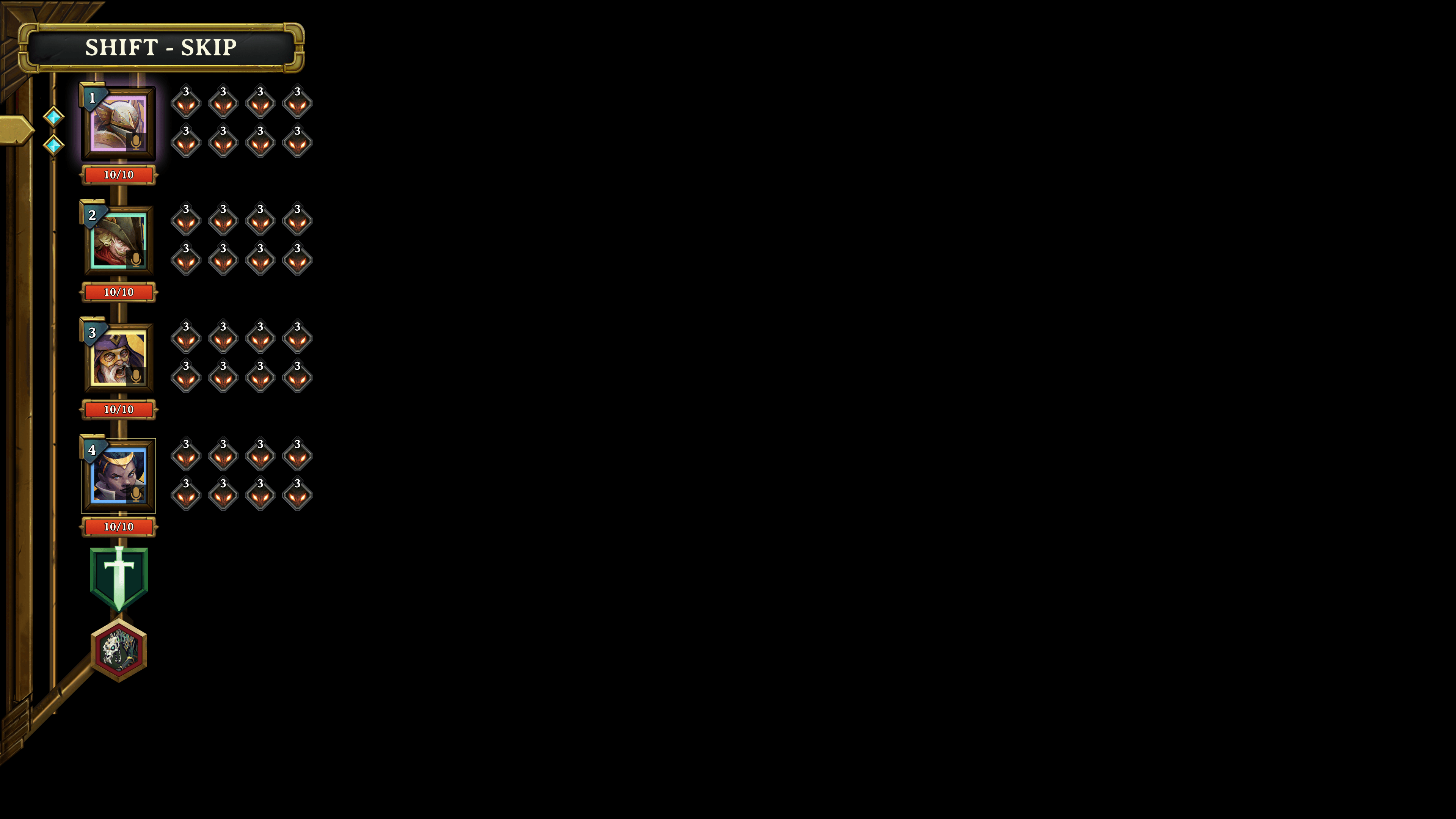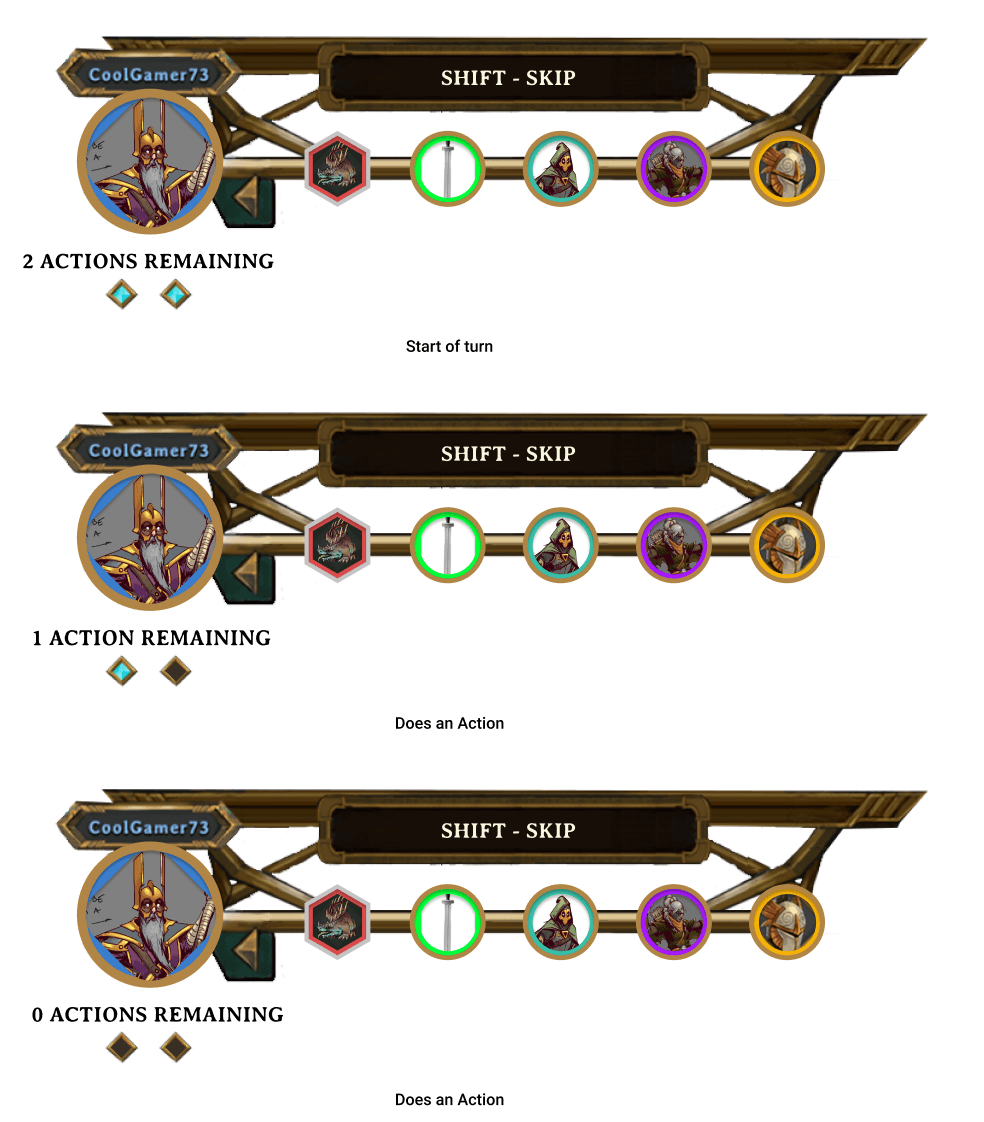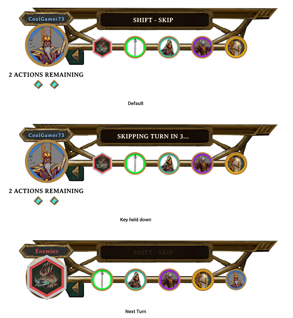 The player must hold down the shift button to skip their turn. This will update the text to show the duration to hold. The skip turn text is only active on the player’s turn. If the player leaves go of the key, it returns to default.