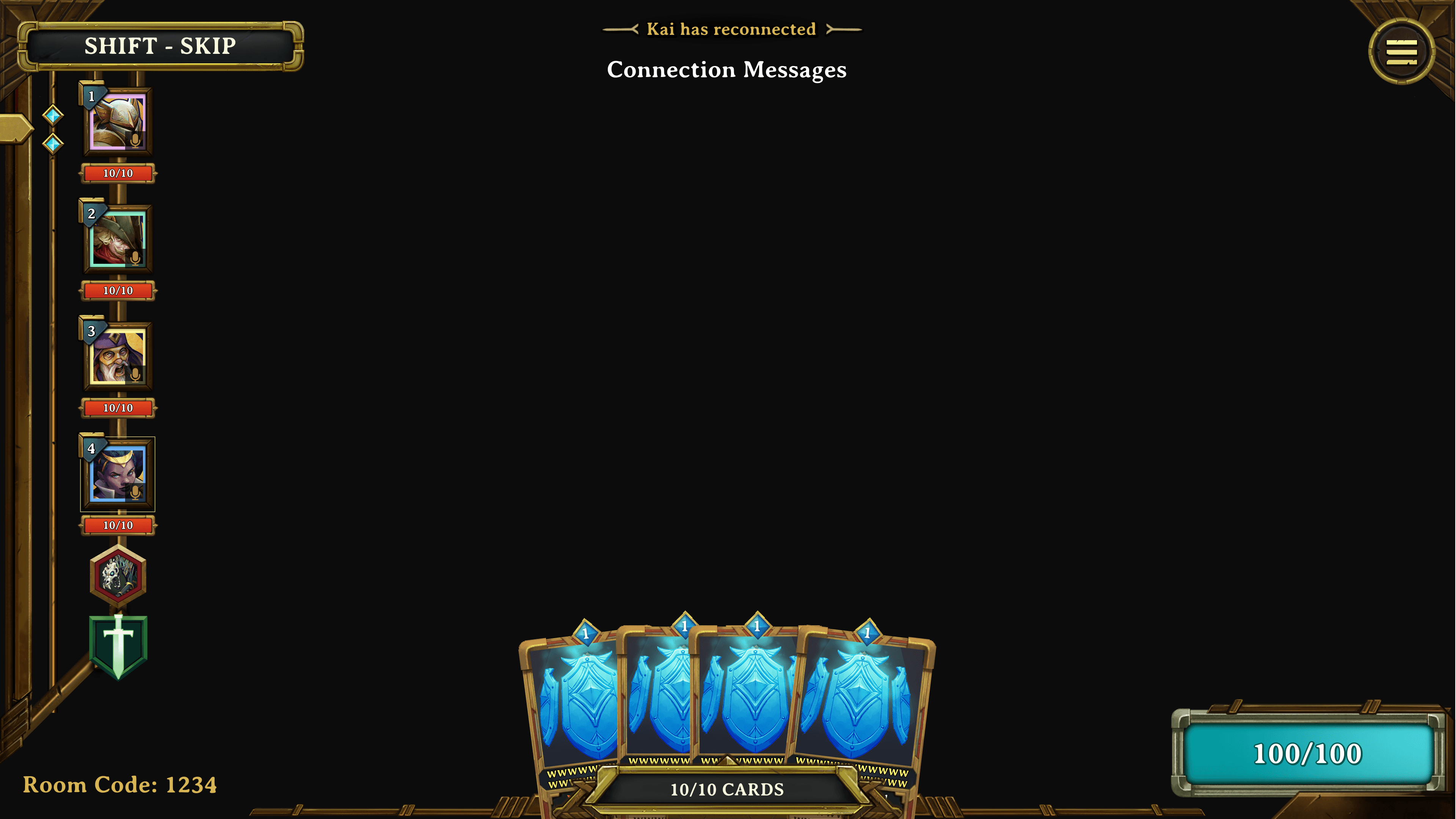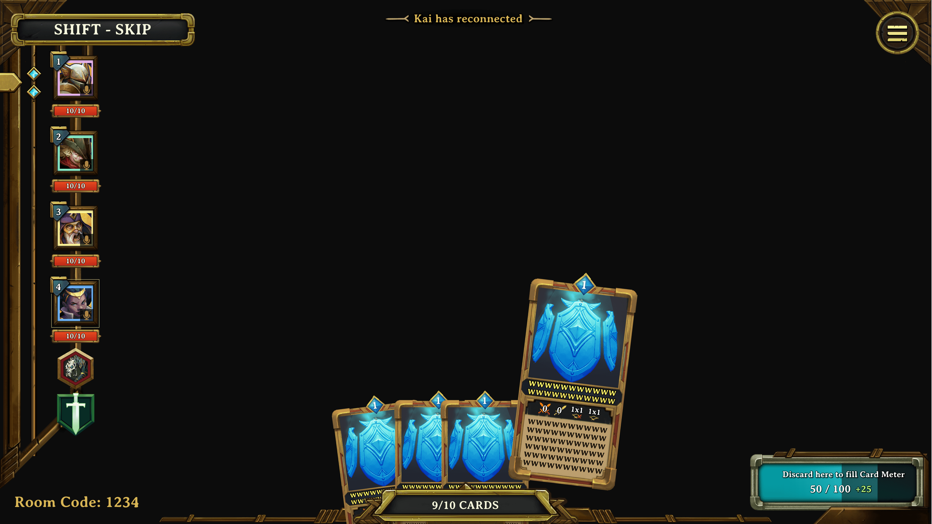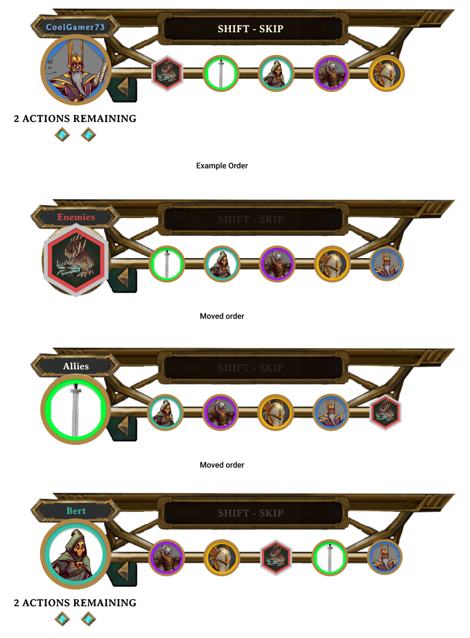 The player must hold down the shift button to skip their turn. This will update the text to show the duration to hold. The skip turn text is only active on the player’s turn. If the player leaves go of the key, it returns to default.