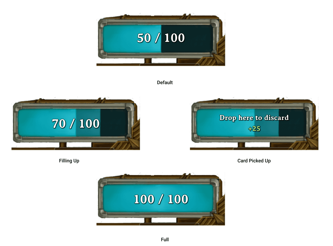 The mana meter shows the player how much mana they have. This will award a new card once it fills up and the player can discard a card to fill up their mana meter. The mana meter is synced between the entire party.