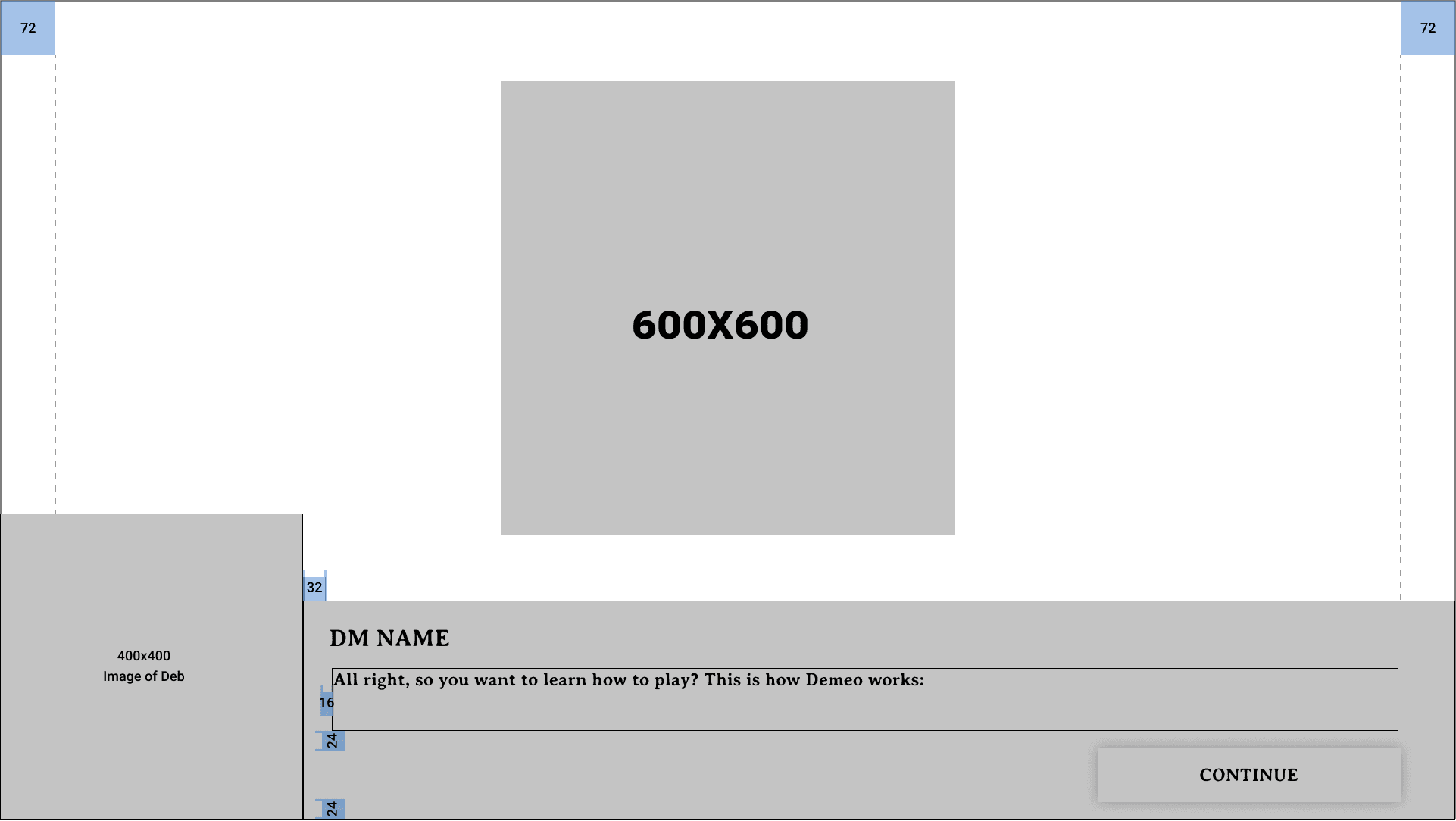 With this, we could then let the artists start exploring the art style they wanted. I made notes for things such as when this dialogue is up, then the player’s screen is darkened and there may be an image or not, or that if there are multiple sections of text, the CTA button should have a arrow to continue the text etc.