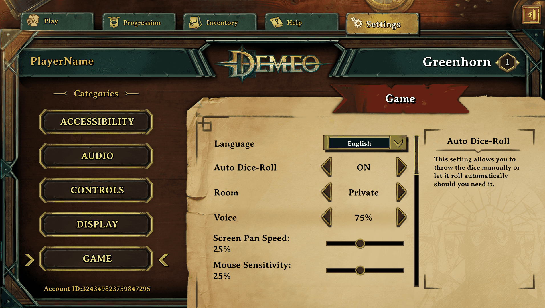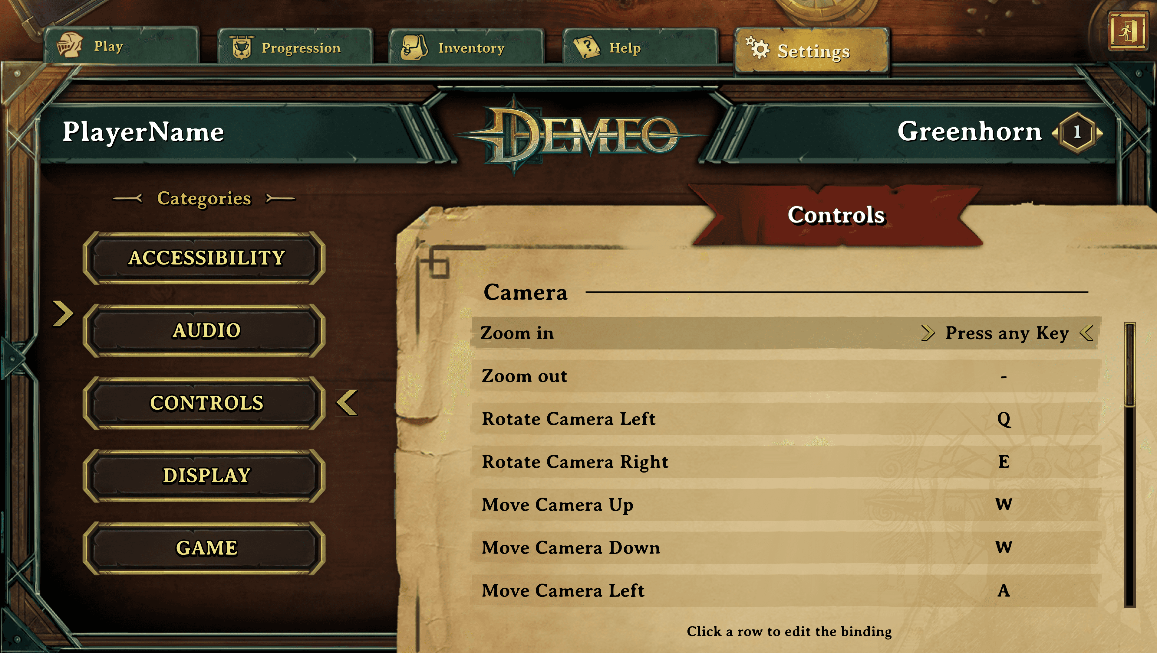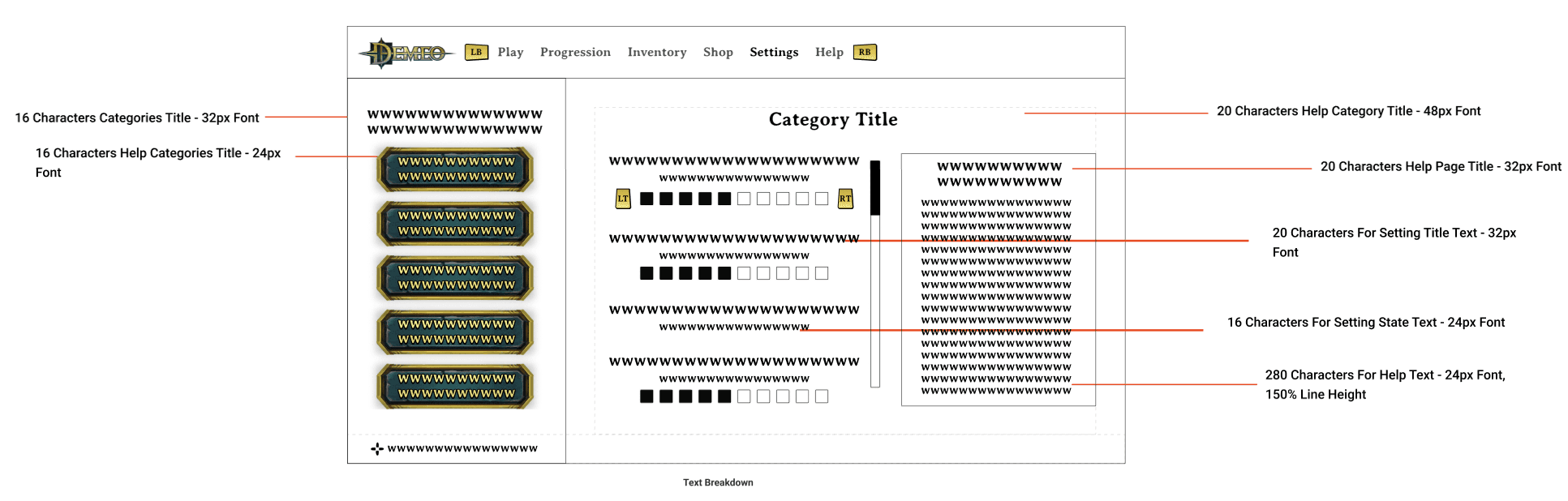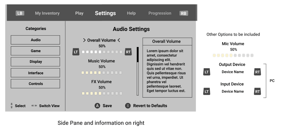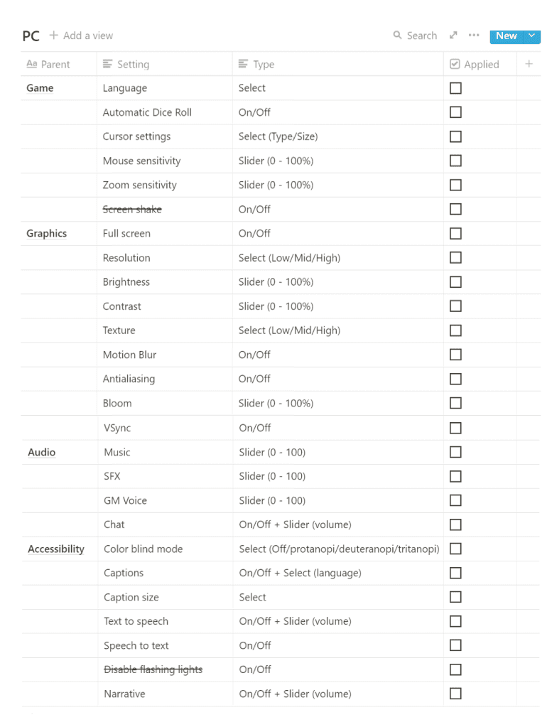 After benchmarking the main settings in similar games, I organized by category, setting, and then the settings to control.