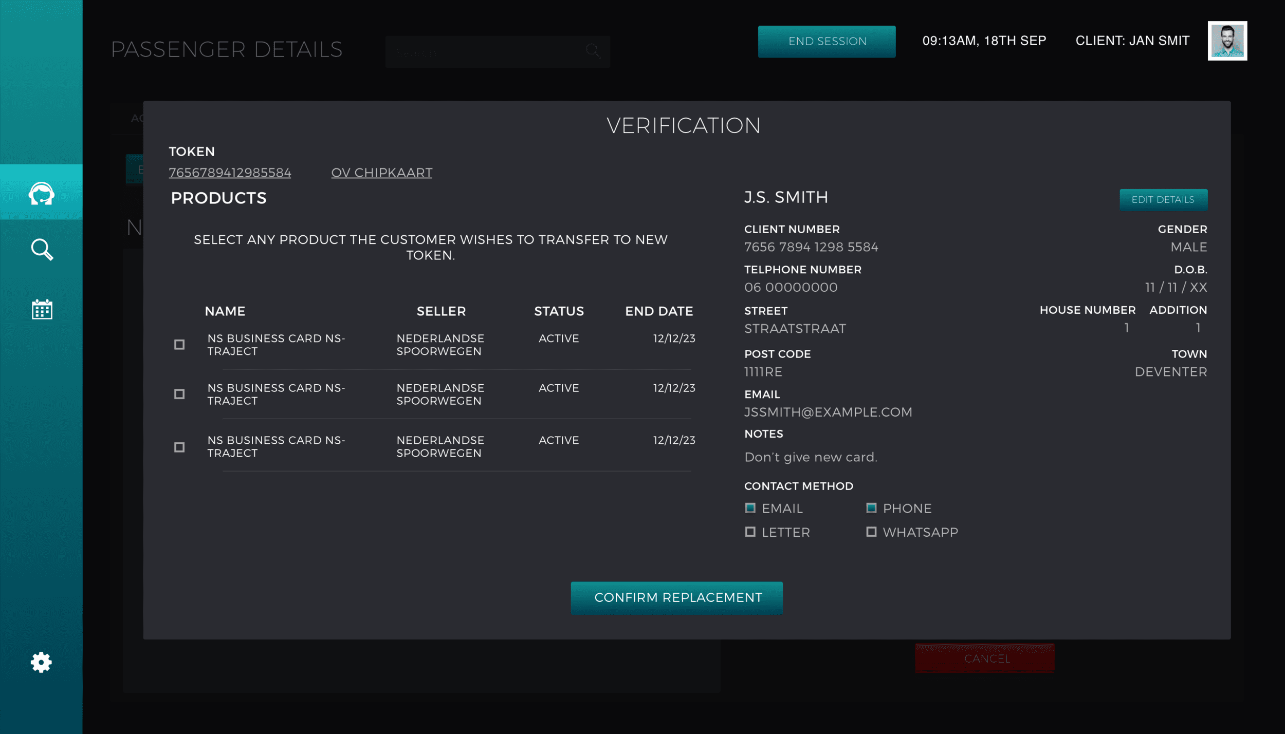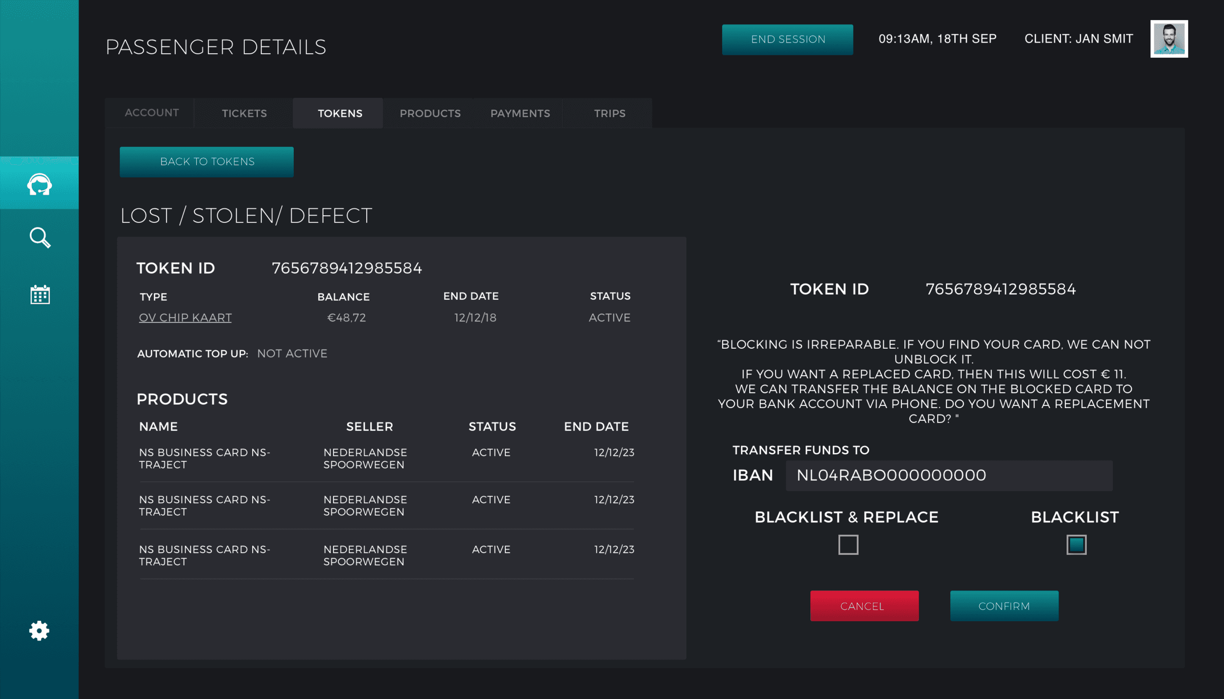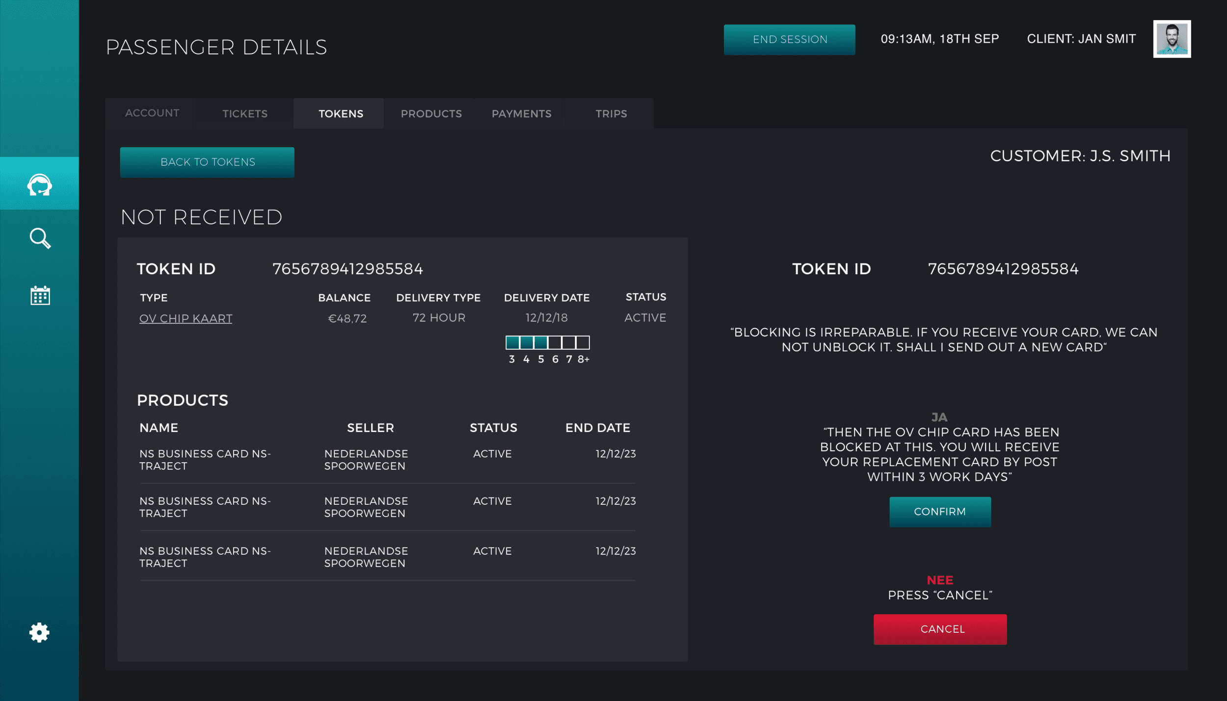 Context specific dialogue cues are given to the representative alongside specific functionality. The reasoning behind this is that although we can blacklist an OVChipkaart and transfer the funds to the bank account of the caller, the bank card is a direct expense item. We can also replace a travel card but the caller’s bank must replace their card and block from future financial transactions. These dialogues are important to clarify as each token is unique and must be accounted for.