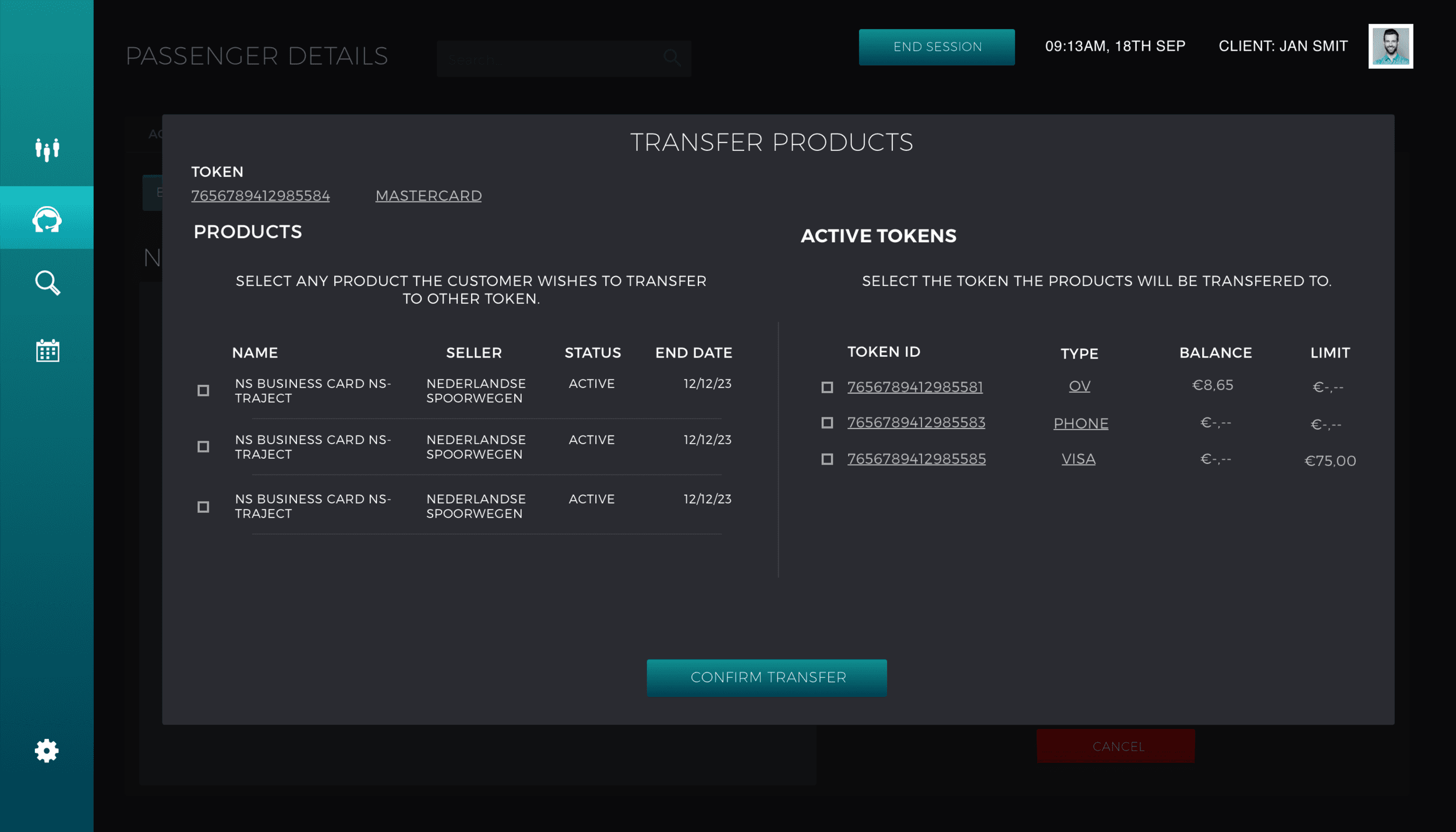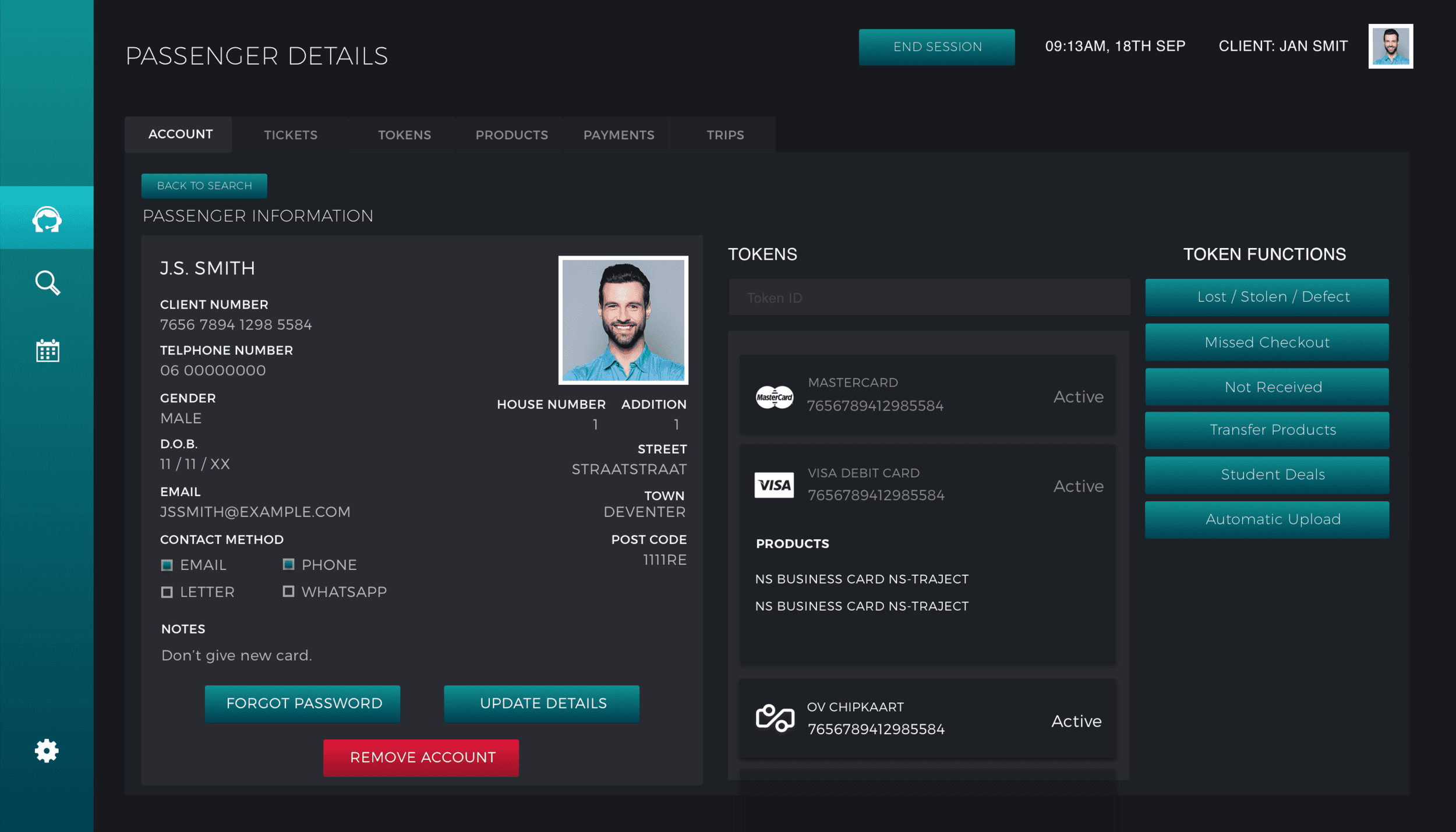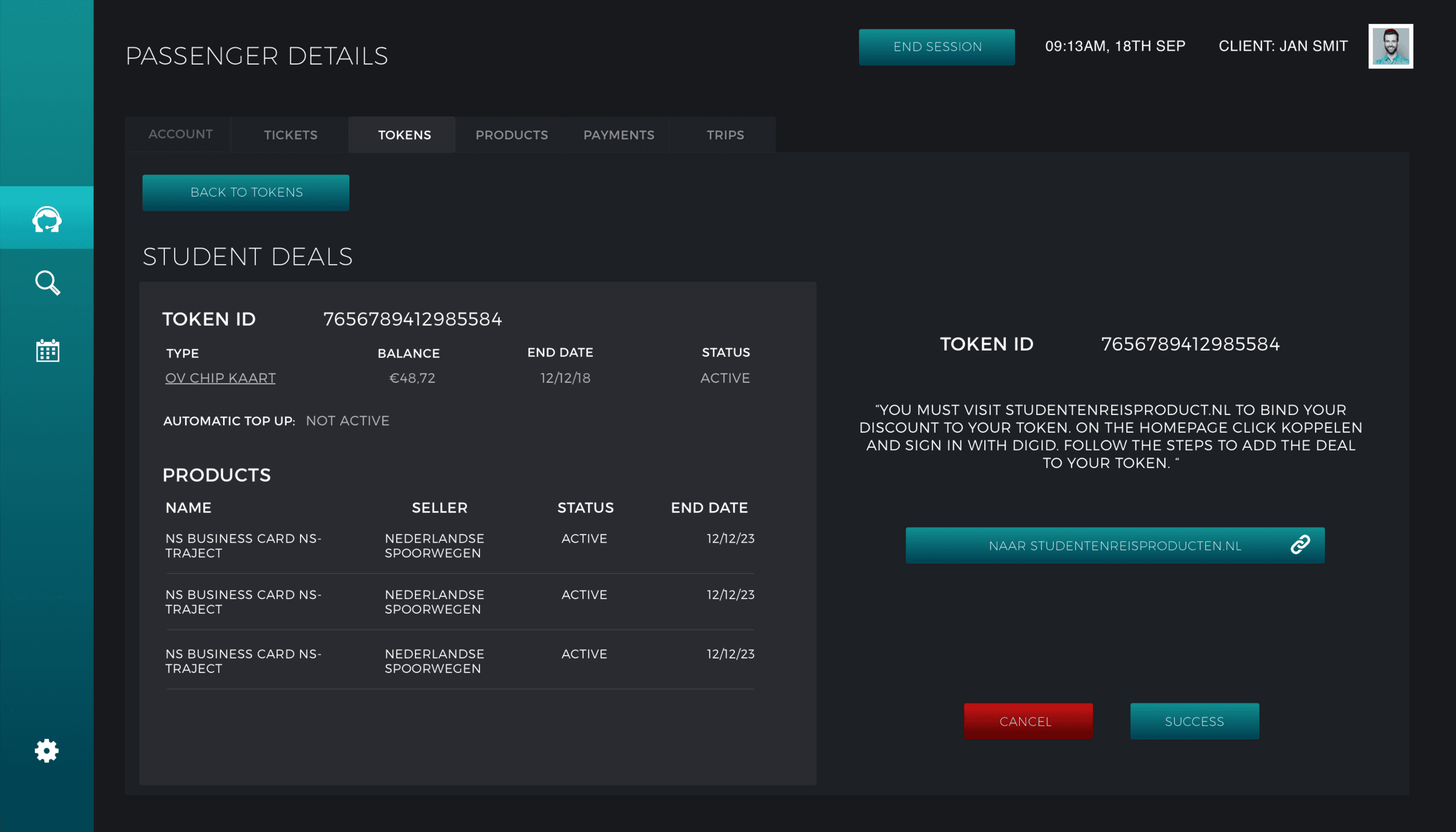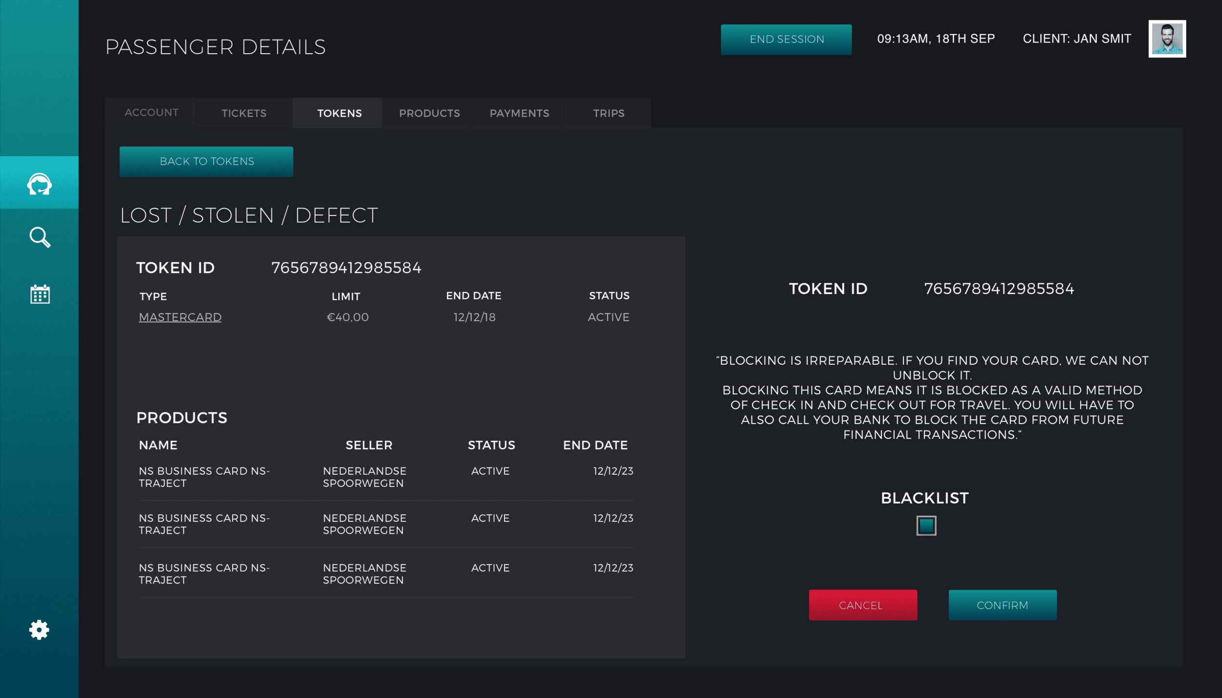Context specific dialogue cues are given to the representative alongside specific functionality. The reasoning behind this is that although we can blacklist an OVChipkaart and transfer the funds to the bank account of the caller, the bank card is a direct expense item. We can also replace a travel card but the caller’s bank must replace their card and block from future financial transactions. These dialogues are important to clarify as each token is unique and must be accounted for.