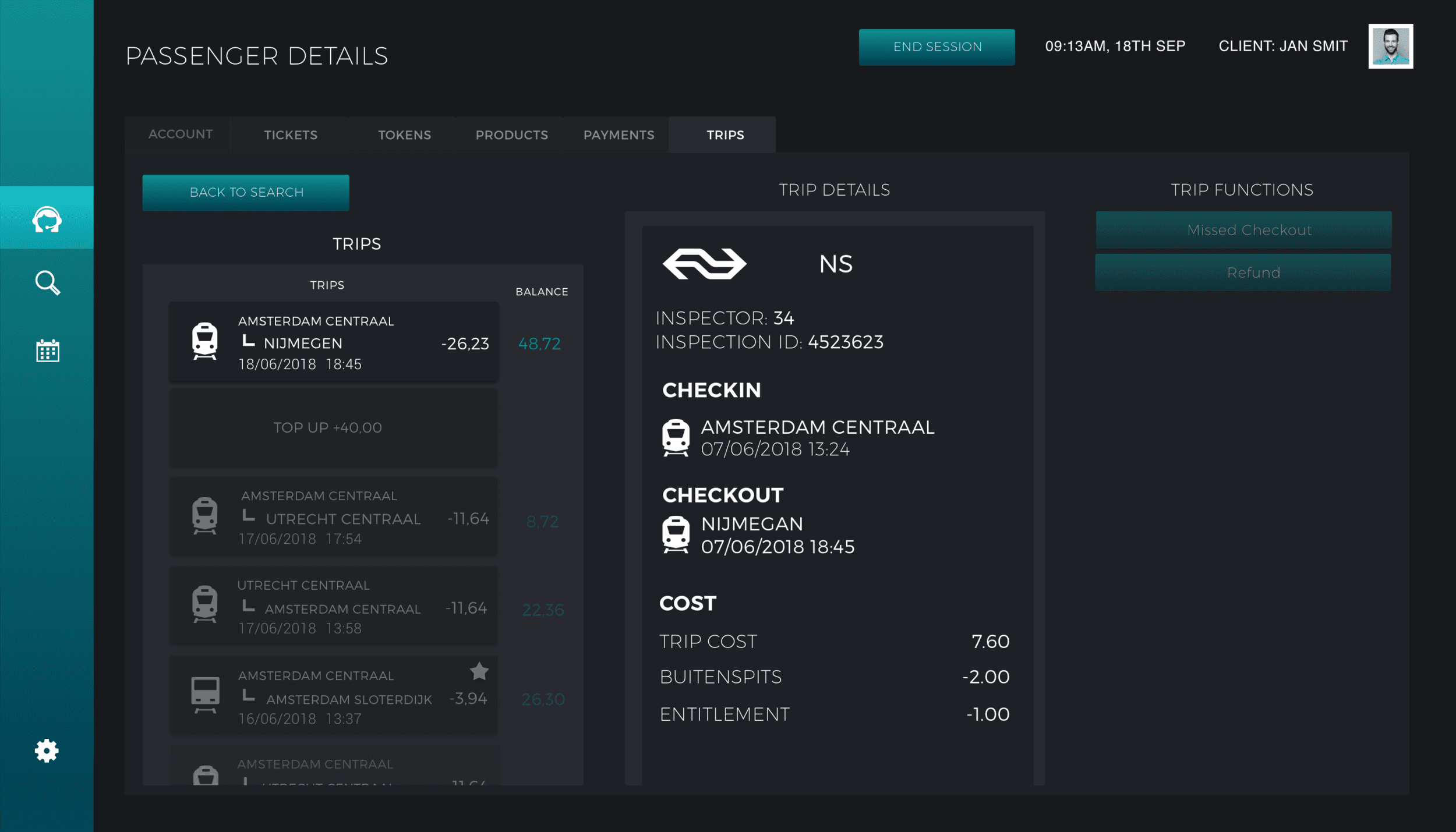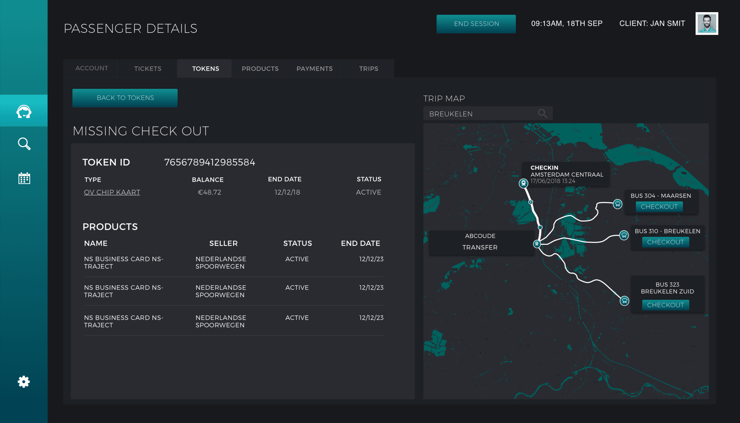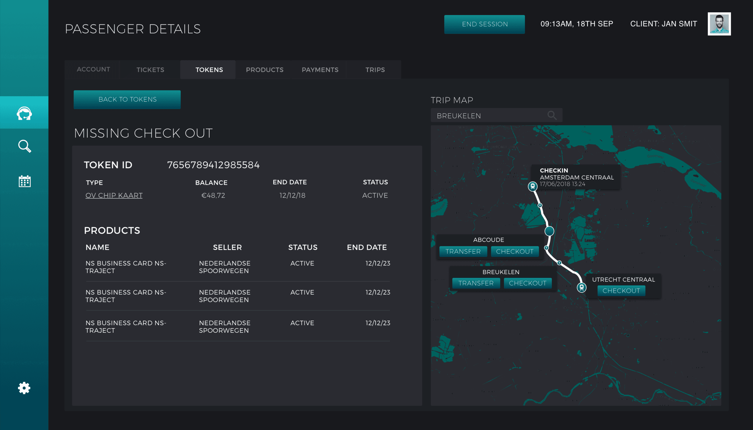 Here we can check the token used and where it was checked in at. Then the available stations from there are shown. As the OV Chipkaart can be used on all transport, a transport to another method is also possible. This distinction is required to allow the payment of the transport operators who provide the separate services.