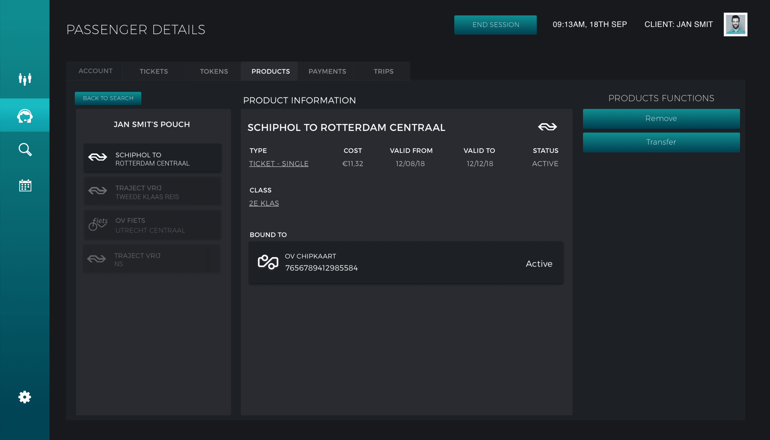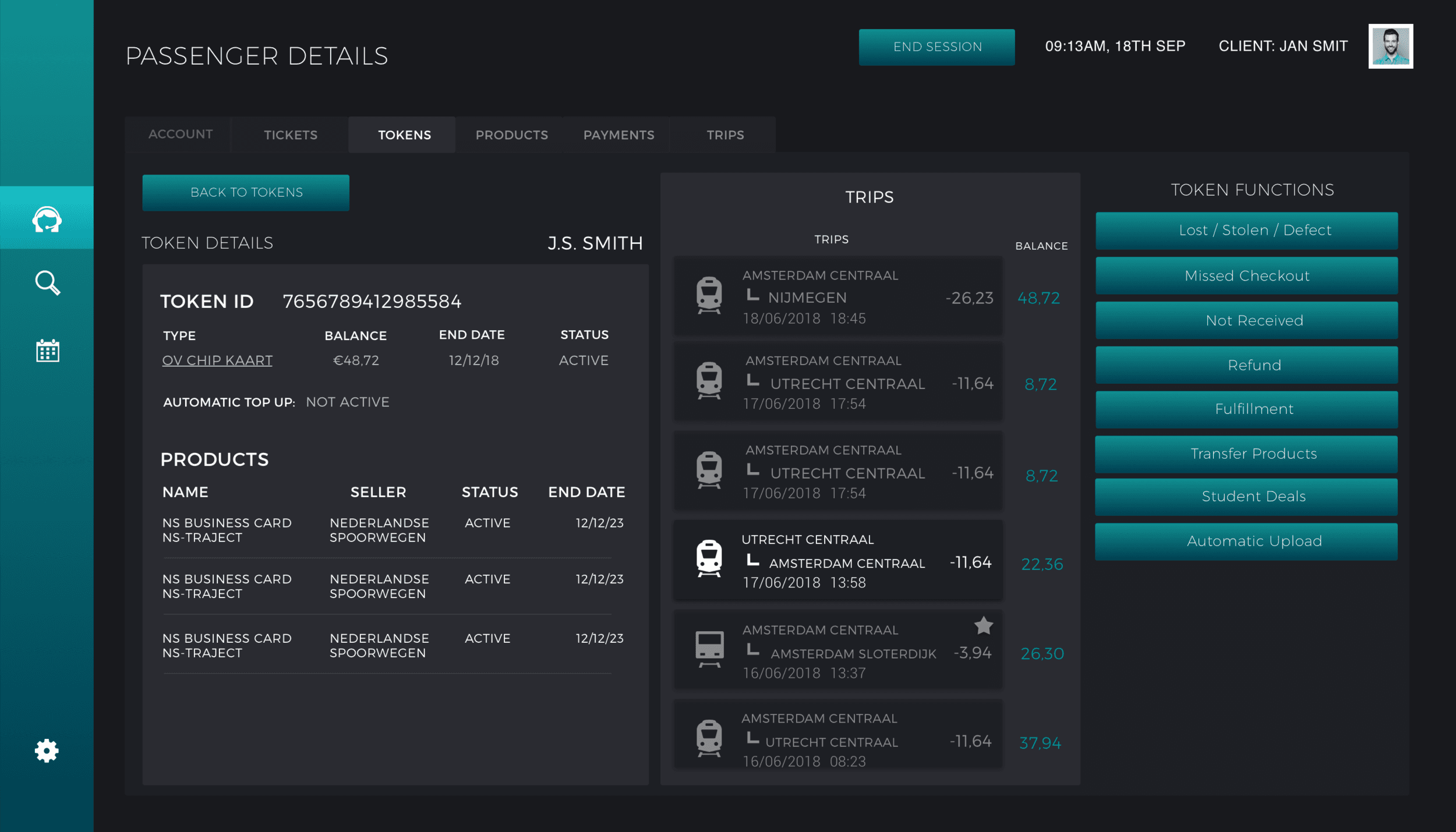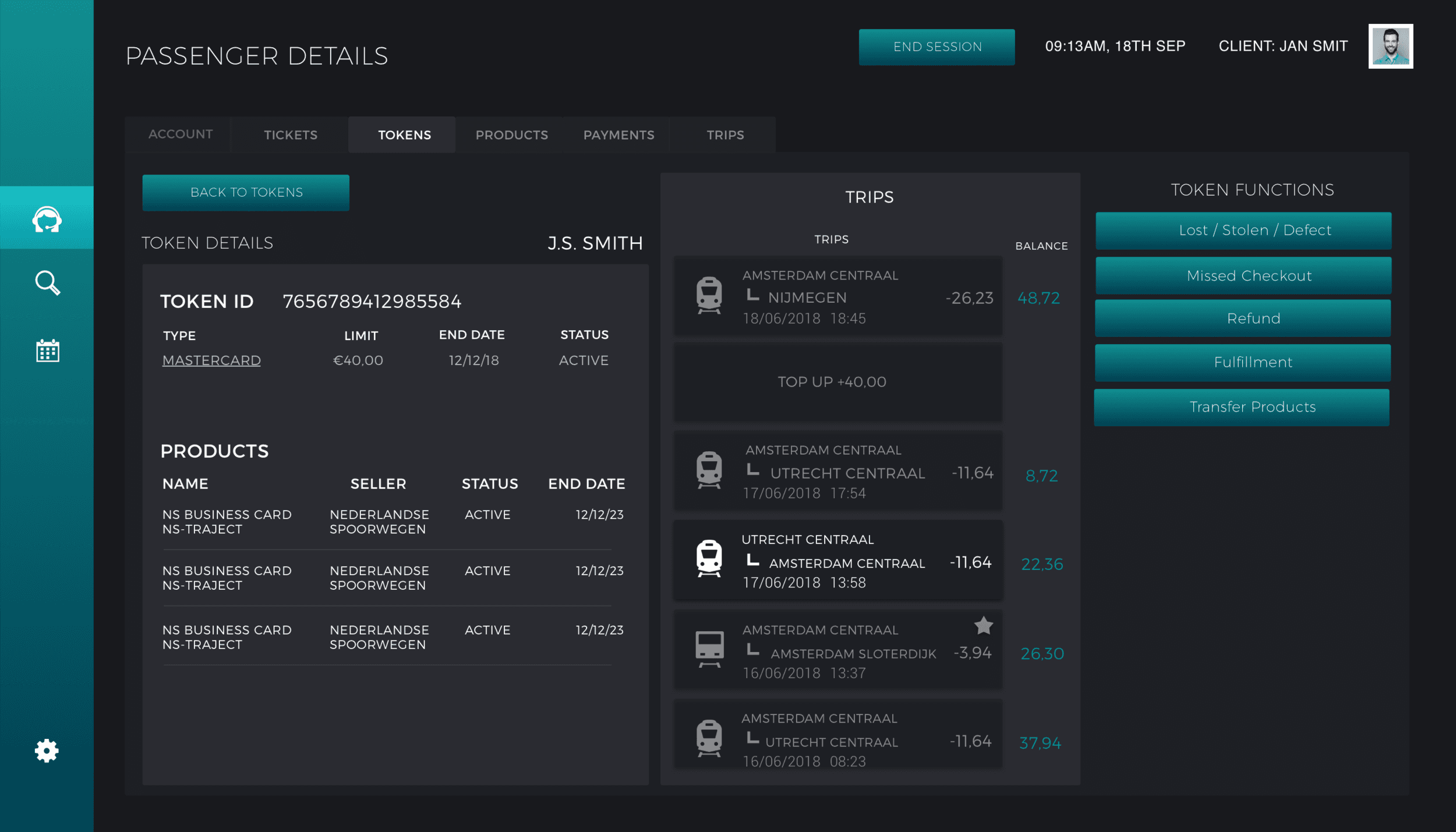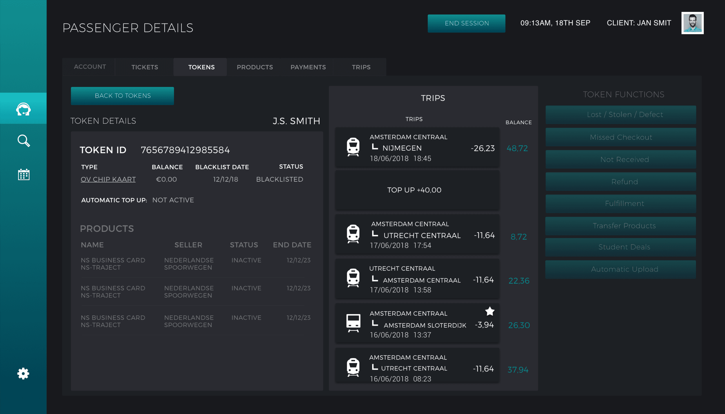 Here we can see a breakdown of the token. The details, products, and trips taken on this token are shown.The functionality on the right is context-specific in terms of the token details we are viewing. Certain tokens cannot be replaced by the OVChipkaart providers e.g. a Mastercard.