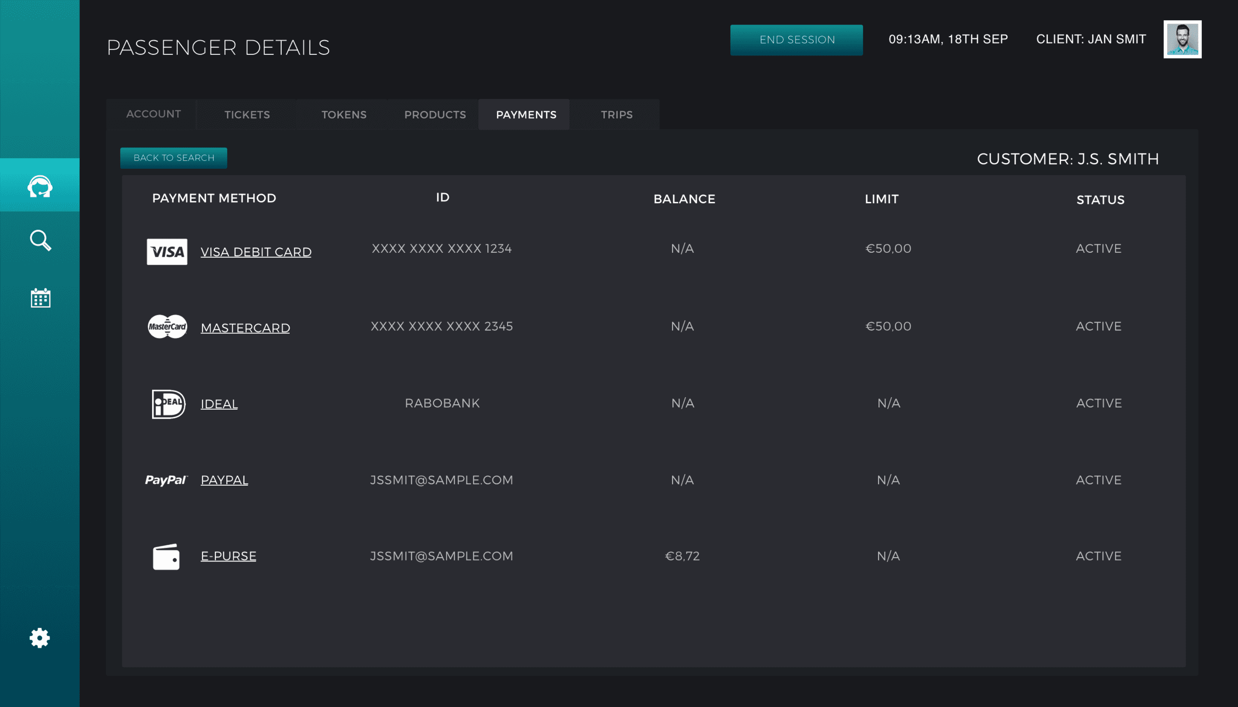 Here we see the payment methods used by the caller, certain ones are direct expense and others are based on a balance.