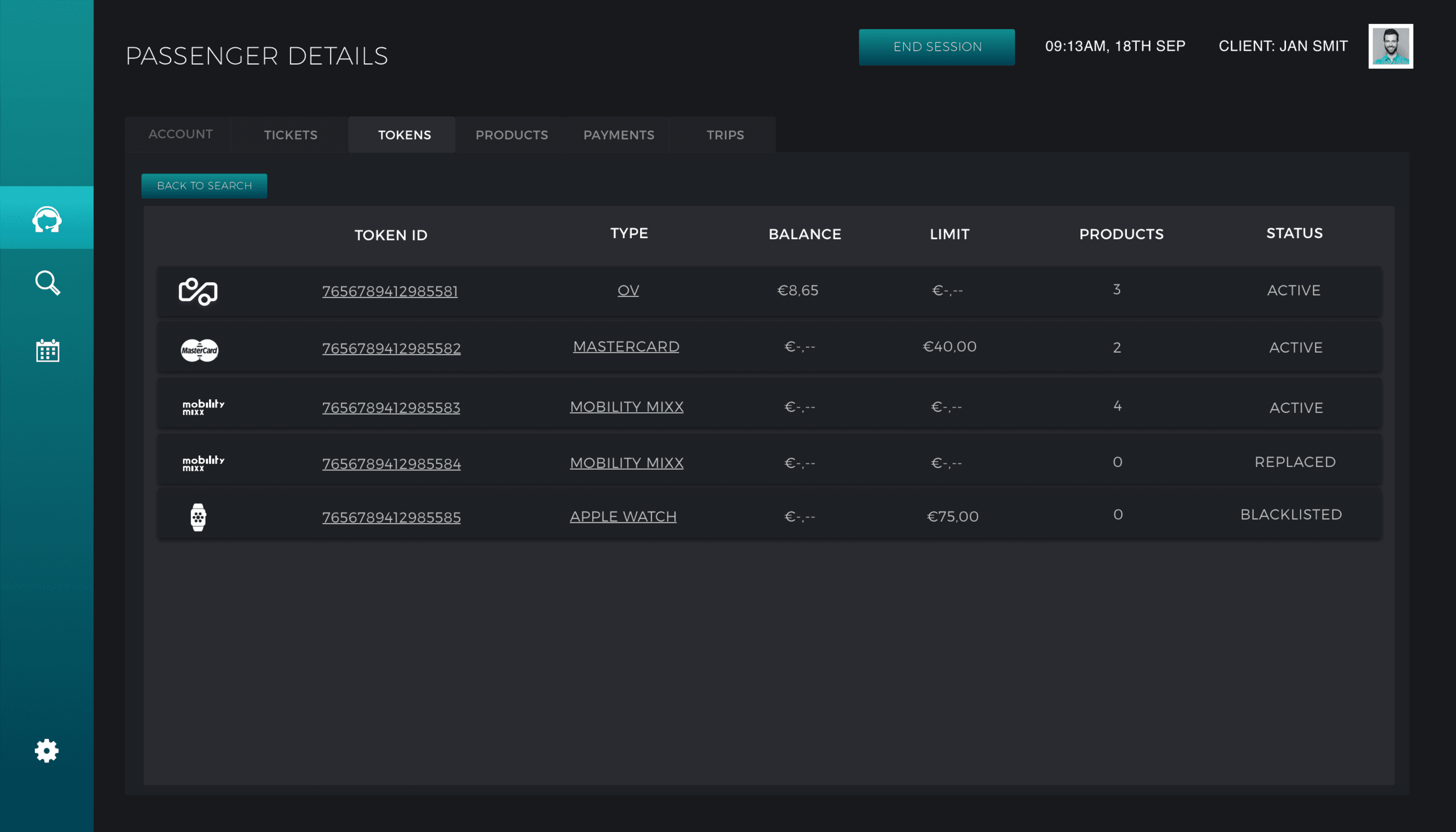 Once consent is given, the tokens used to travel by the passenger are shown. The products on these tokens are shown to help identify the need of the caller. Once a token is selected, the functions on right are available to use. These represent the types of calls received by the customer care centres.