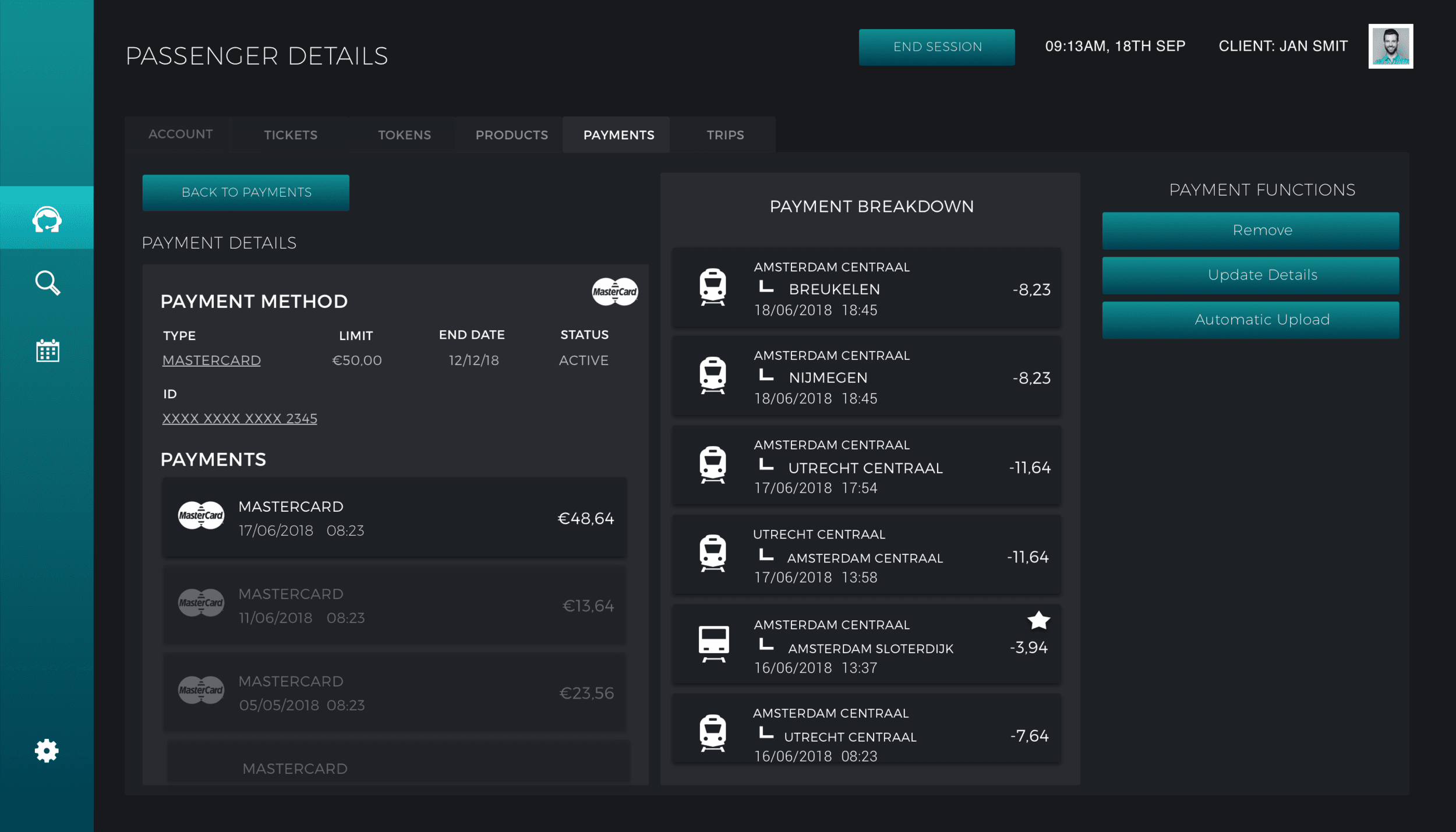 Here we see the history of payments undergone by the payment method. Each payment is a collection of trips and these trips are shown once a payment is selected. The functionality is similar to the token functionality in that we can allow automatic top up, remove a payment or update the details.