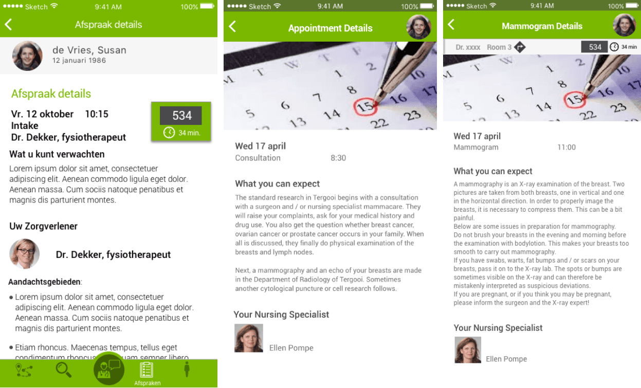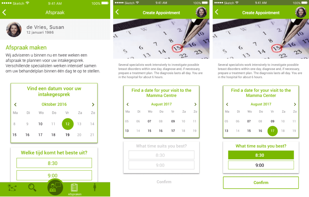 In the ideal world, the ability the arrange an appointment at the hospital without the need to call the hospital becomes closer to reality with the development of automated systems. This feature is shown in three of the patients visitors may wish to choose in the E-Studio.Important things from our research with patients are visibility of time and date choices, appointment confirmation, information about the appointment.