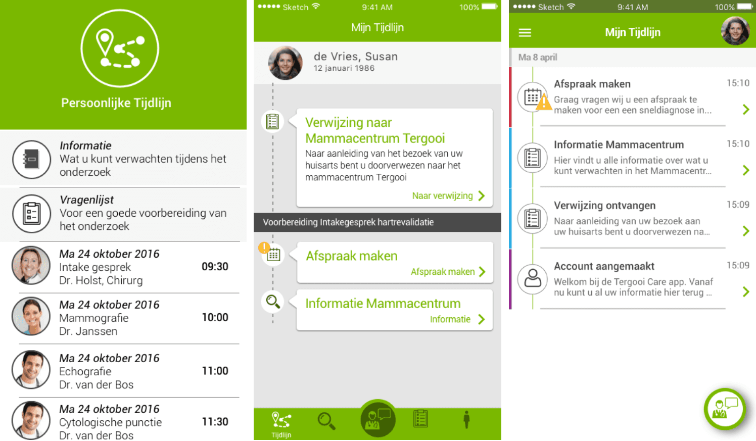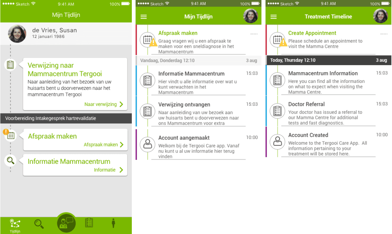 At the very top of the third iteration, you see that the current day is shown. We looked at how this time bar could divide the items by done / to do. Enter the fourth iteration, and the current design.The time bar was changed to a dark scheme in order to ease readability. Everything under the bar would be items in the past. Items above the time bar, which shows today’s date, are items that are upcoming for the patient. Bring important items for the patients to the forefront.