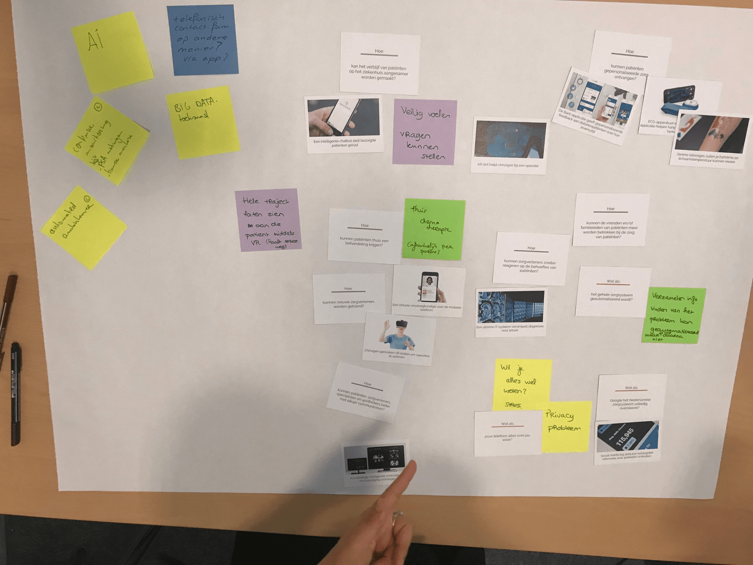 After the exploration of the studio, a more general ideation phase took place to get the idea of what the nurses and doctors found to be needed in general in the medical industry and what they perceived the future of medical systems to contain to aid them in their job. Idea cards were printed out to help generate ideas in the form of open-ended questions for participants who had a harder time with imagining from the top of their head.