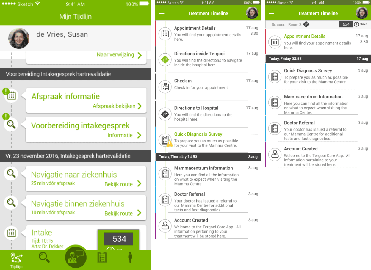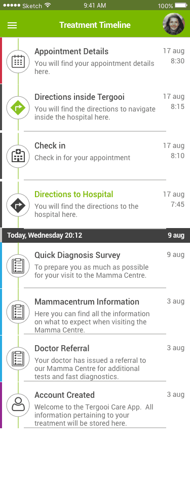 You will also see that the items are categorised and have a relevant icon to the type of timeline item it is. These can be filtered from the menu to allow the patient to highlight which items they wish to view.Upon using the system for the first time, the patient gets an information pack about the department they are visiting. Interviews with patients said that information about where they would be visiting was hard to find, so an information package is sent to them here!Also you will notice that both directions to and inside the hospital are given, taken from the registered address of the patient. These features are implemented as we want the entire system to revolve around the patient, it is patient-centric. The major thing to realise is that the patient journey does not begin inside the hospital. As soon as the patient needs to go to the hospital, we cater from that point on.