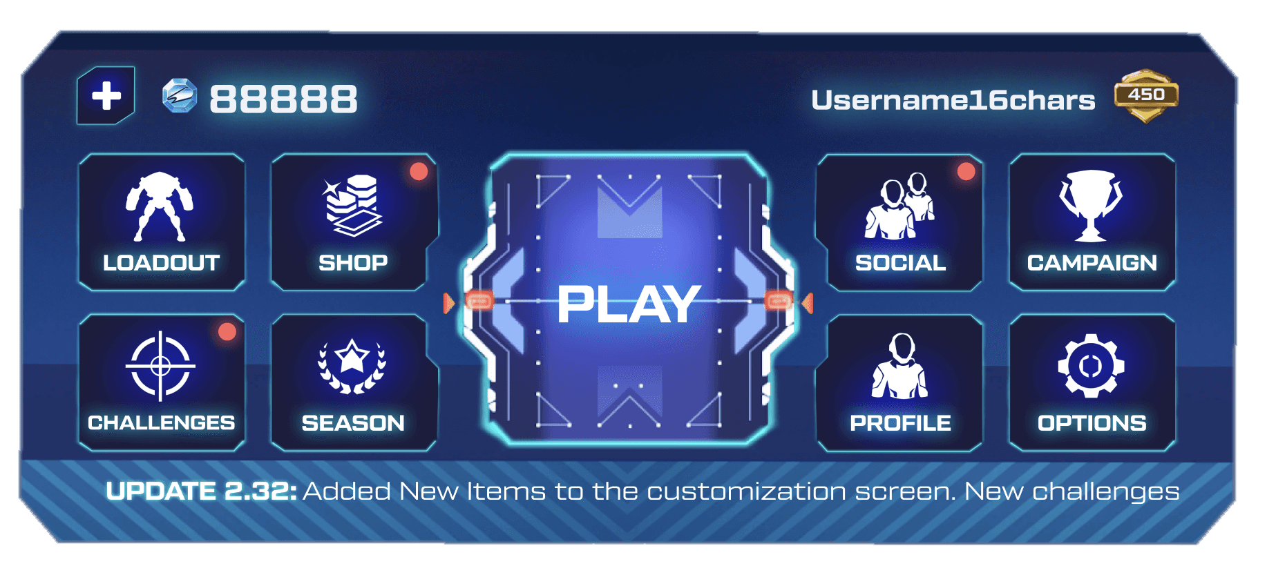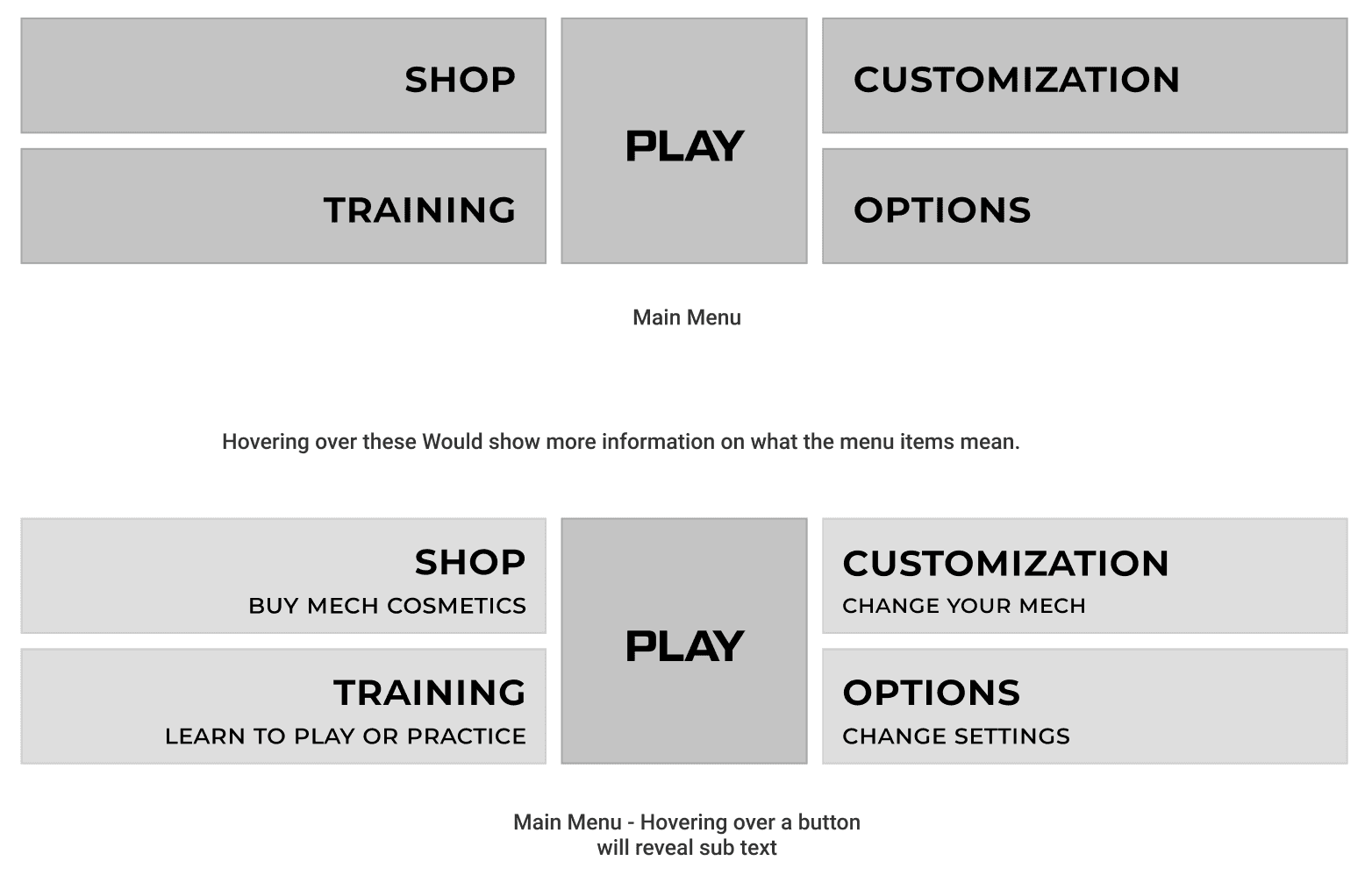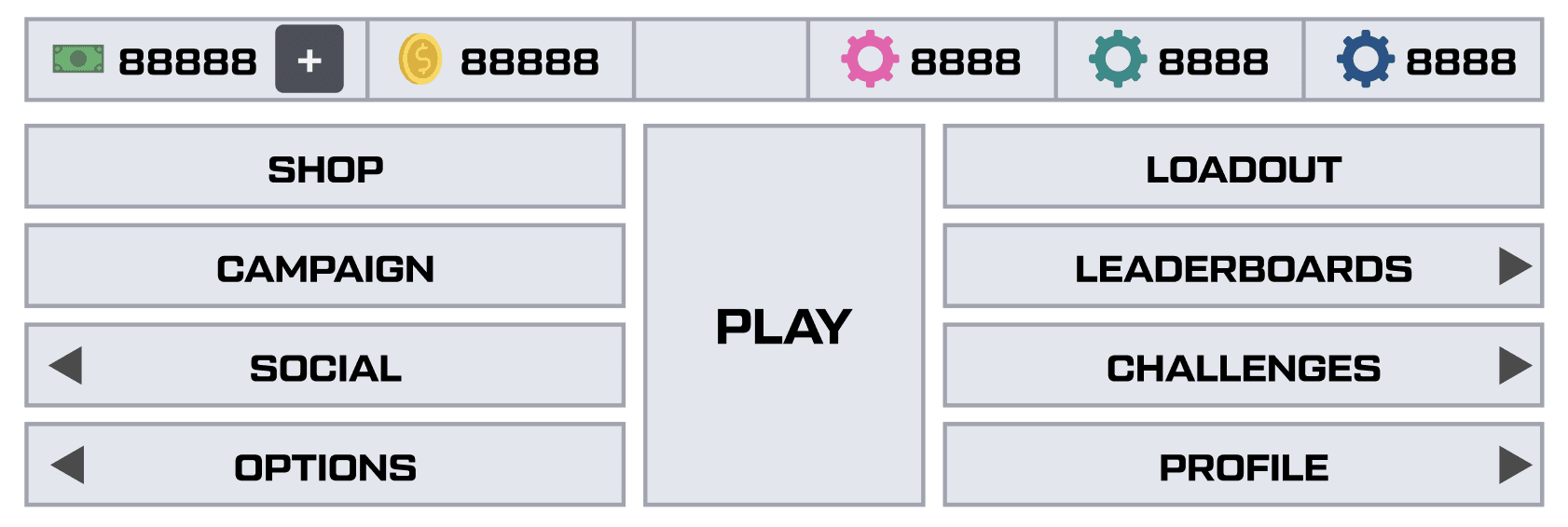 The team were wanting to minimize the play options to have training, quick play, and other game modes under a central play menu, the currency and shop systems were still not confirmed so the menu got a quick do over to simplify it.