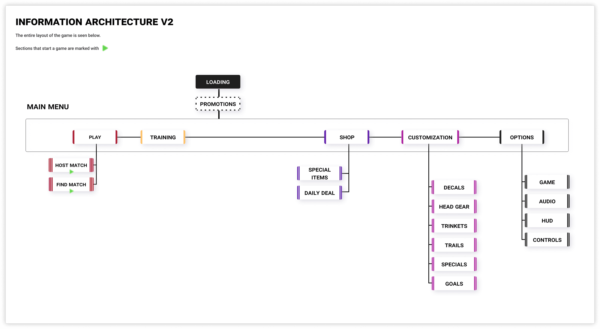 The architecture and flow diagrams for the experience were updated with every step of the UI change, over the course of 2 years there were lots of micro-changes and tests with both layout, flow, and art for the menus. It was really interesting to get into the engine and work on these interfaces!