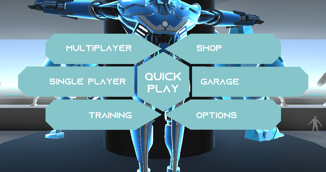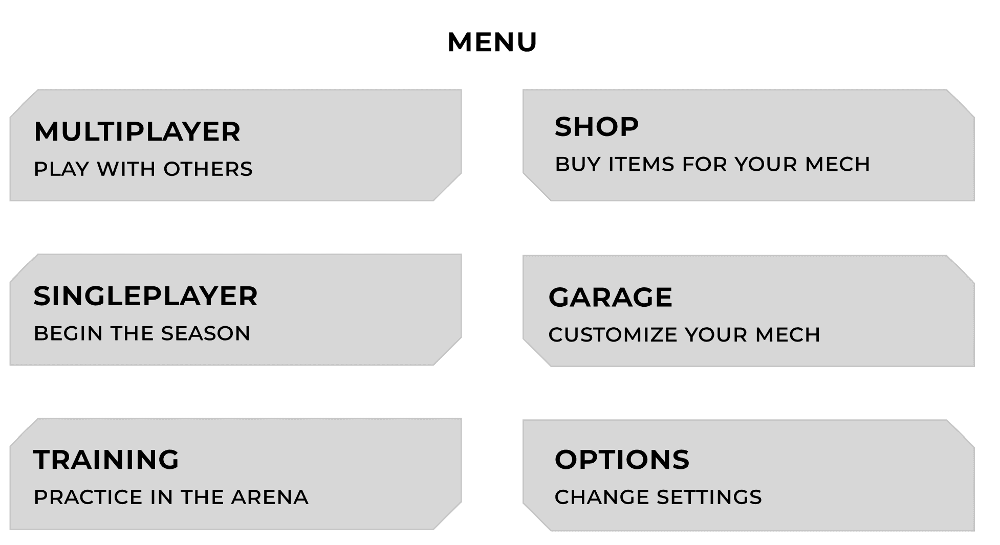 The main menu for Ultimechs is the first thing players will see when they reach the garage area. It is the jump point to the systems the player will need in their journey.