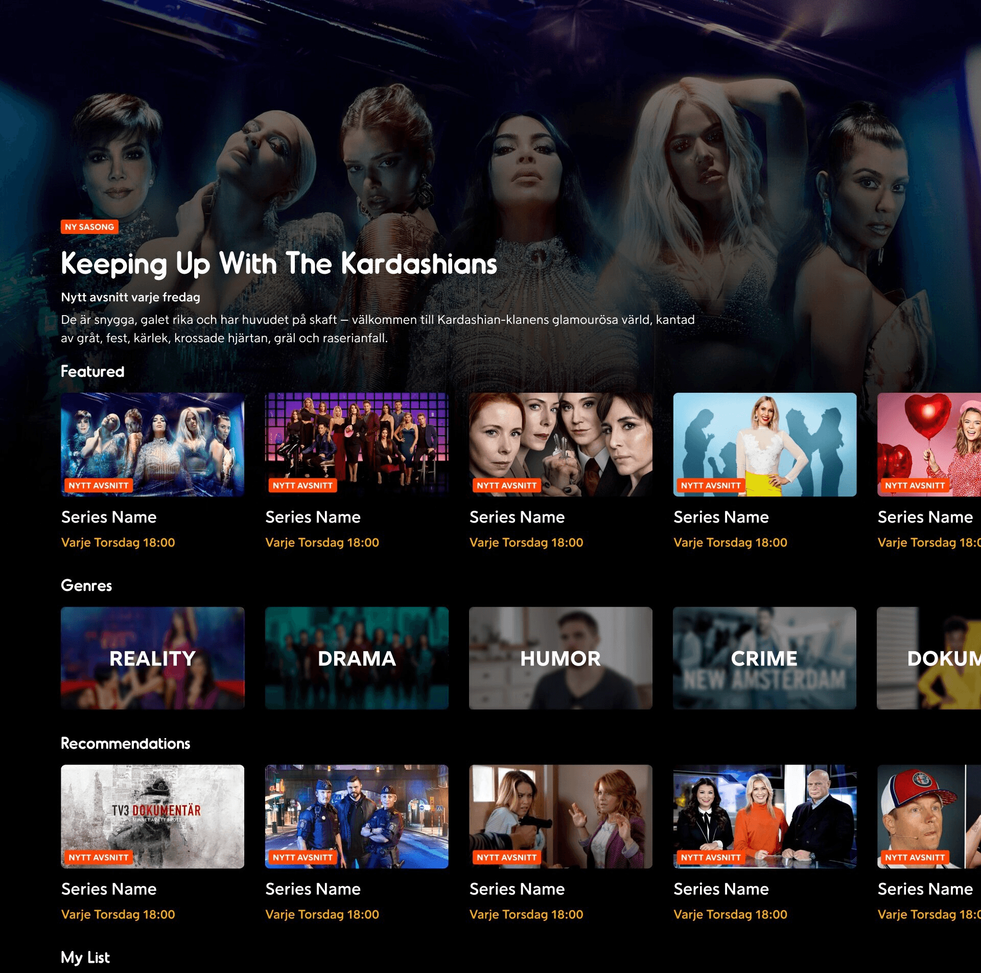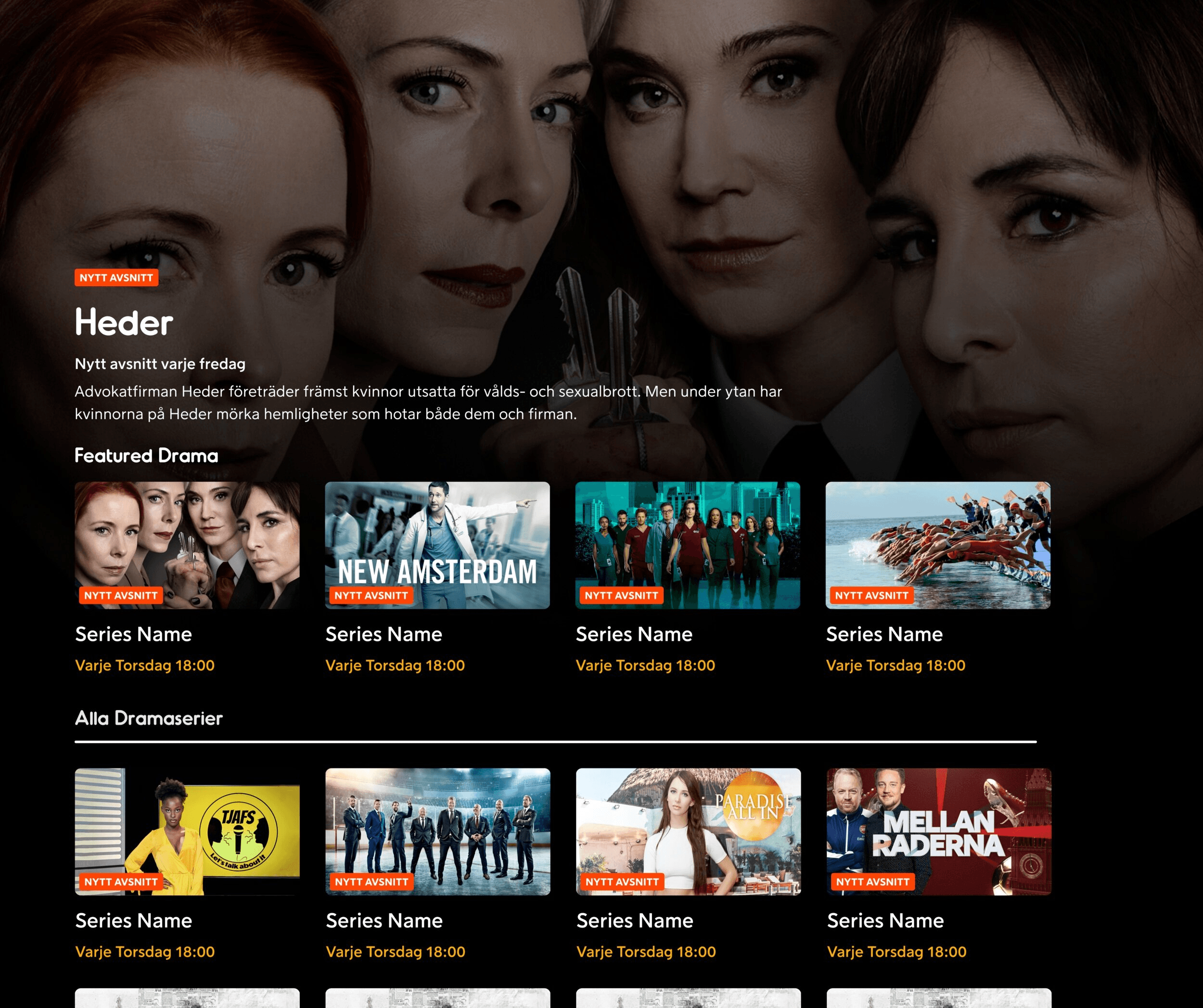The genre pages have received a similar touch up. They have the featured area for the promoted items set by content editors instead of just the entire list of content. The content grid has been updated to show the updated cards for series with proper titling of content sections.
